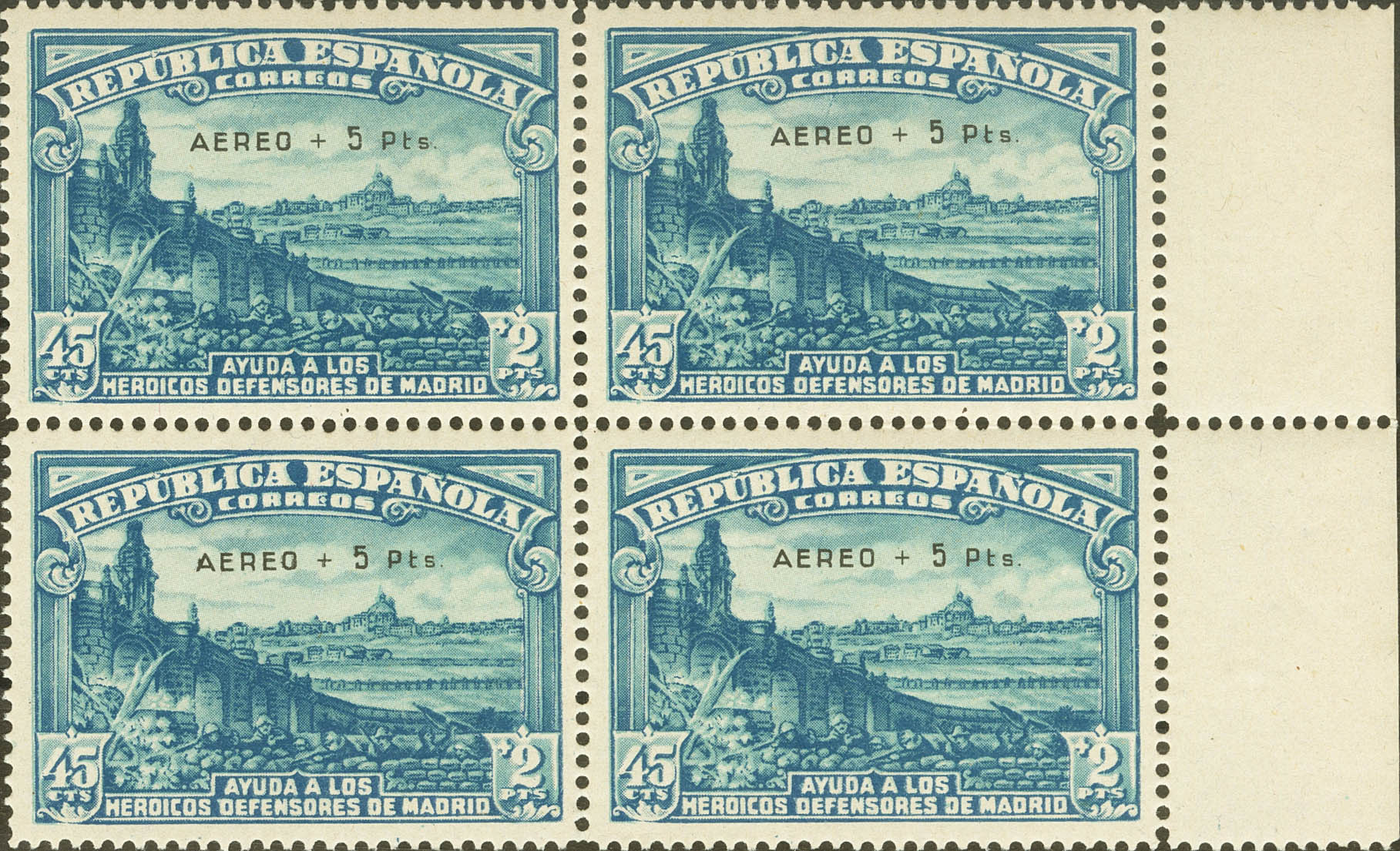 ★★ 759(4). 1938. AEREO+5 PTS, bloque de cuatro, borde de hoja. MAGNIFICO Y RARO. Cert. CEM. Edifil 2024: +2.800 Euros