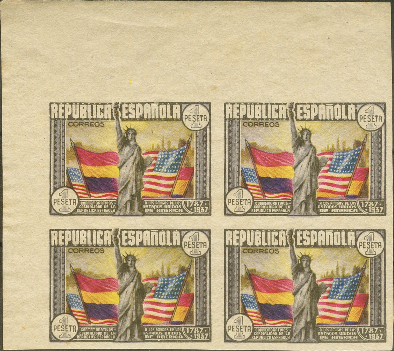 ★★/★ 763s(4). 1938. 1 pts multicolor, bloque de cuatro, borde de hoja (fijasellos en los sellos superiores). SIN DENTAR. MAGNIFICO. Edifil 2024: +358 Euros