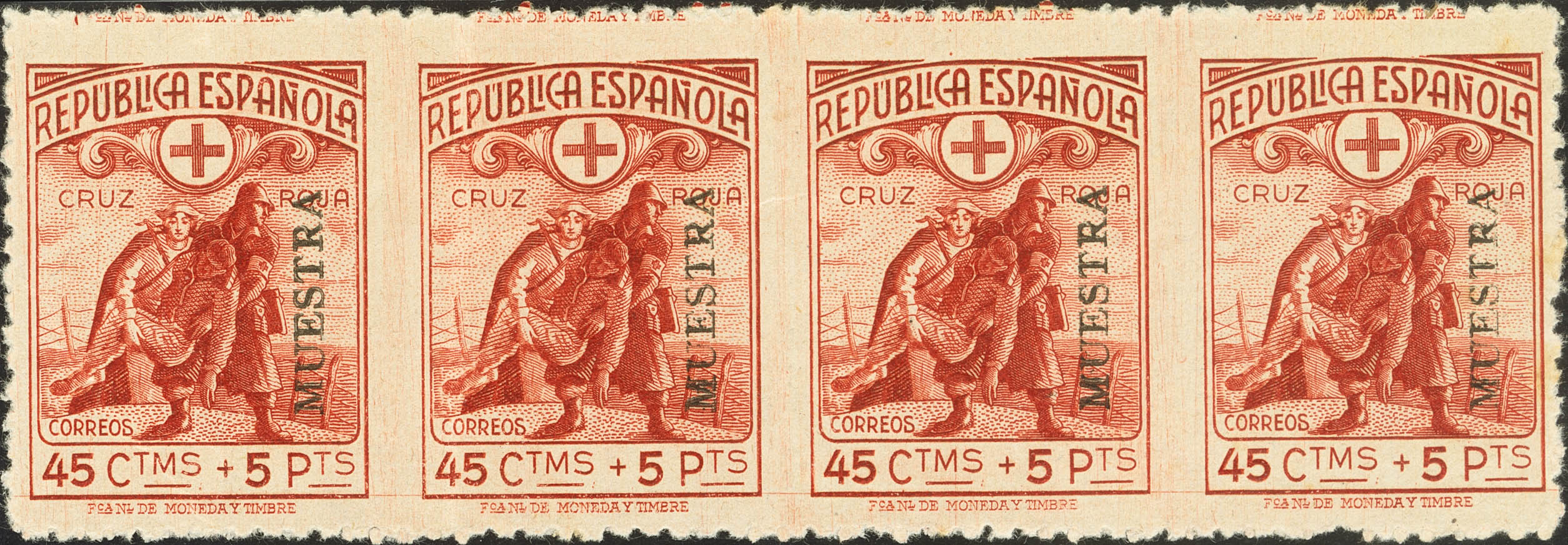 (★) 767M(4). 1938. 45 cts + 5 pts rojo, tira de cuatro (conservación habitual). SIN DENTAR ENTRE LOS SELLOS. MAGNIFICA, NO CATALOGADA.