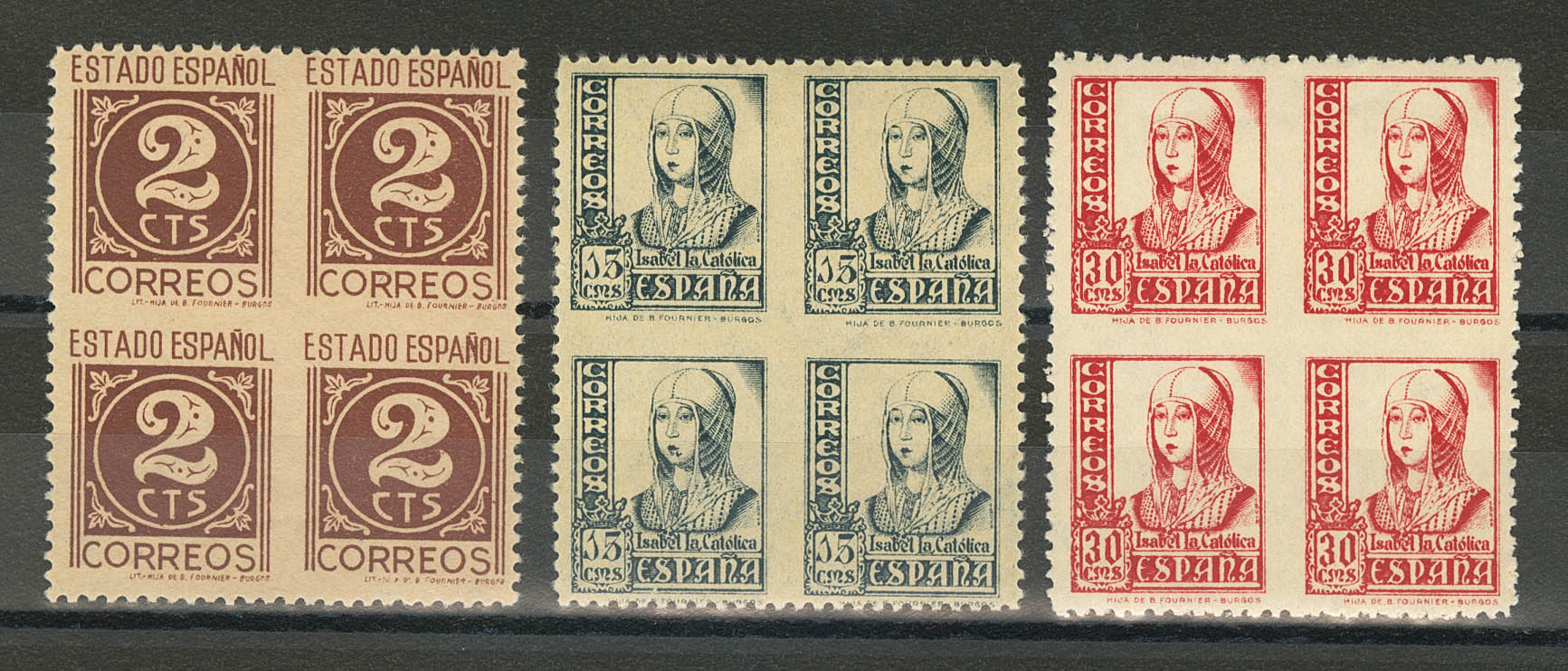 ★★ 815sbc, 820sbc, 823sbc. 1937. 2 cts, 15 cts y 30 cts, bloque de cuatro. SIN DENTAR ENTRE LOS SELLOS. MAGNIFICOS. Edifil 2021: 120 Euros