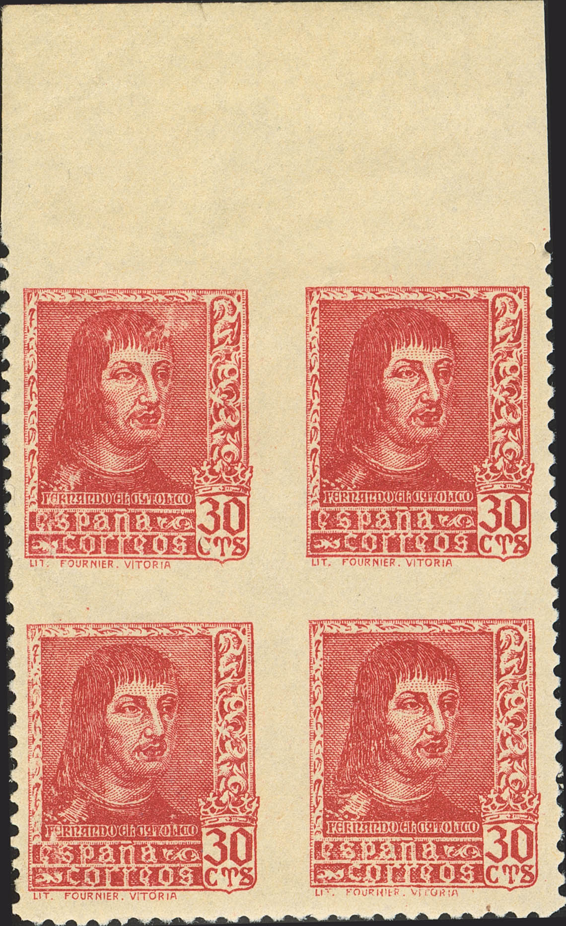 ★★ 844A(4). 1938. 30 cts rojo. SIN DENTAR ENTRE LOS SELLOS y SIN DENTAR EL MARGEN SUPERIOR. MAGNIFICO Y RARISIMO, NO CATALOGADO.