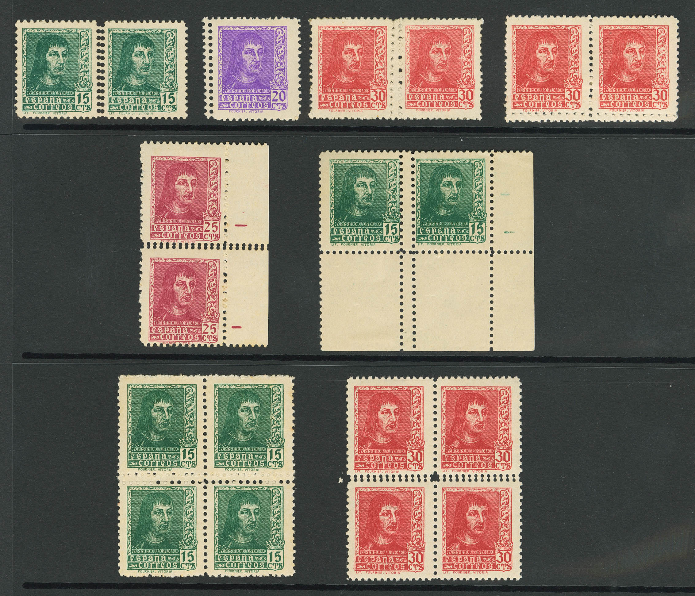 ★★/★1938. Conjunto de un sello, cinco parejas y dos bloques de cuatro de diversos valores, todos ellos con la variedad DENTADO DOBLE. MAGNIFICO CONJUNTO.