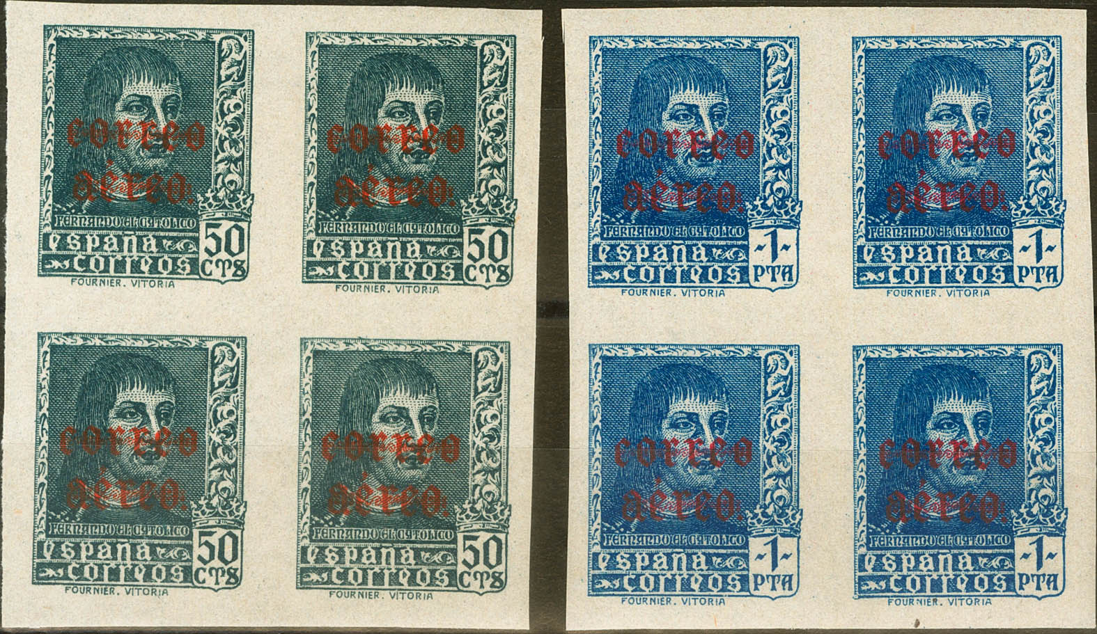 ★★ 845/46s(4). 1938. Serie completa, bloque de cuatro. SIN DENTAR. MAGNIFICA Y RARA. Edifil 2024: +1.240 Euros