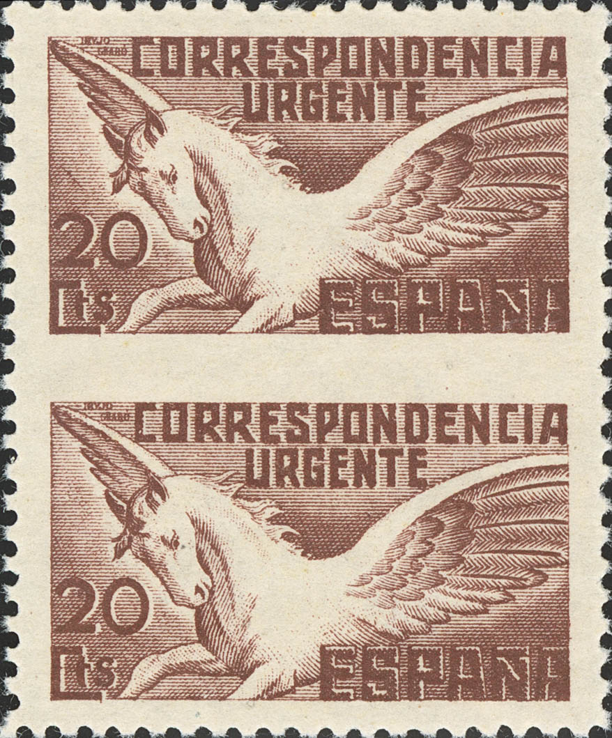 ★★ 861spv. 1938. 20 cts castaño, pareja. SIN DENTAR ENTRE LOS SELLOS. MAGNIFICA. Edifil 2021: 24 Euros
