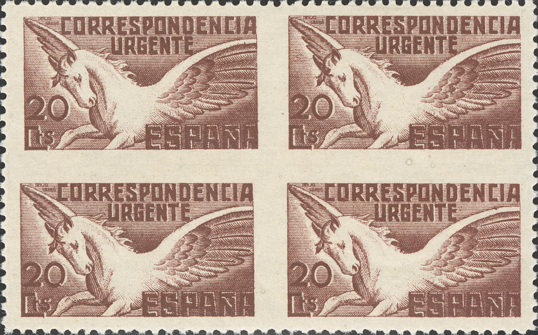 ★★ 861sbc. 1938. 20 cts castaño, bloque de cuatro. SIN DENTAR ENTRE LOS SELLOS. MAGNIFICA. Edifil 2021: 38 Euros