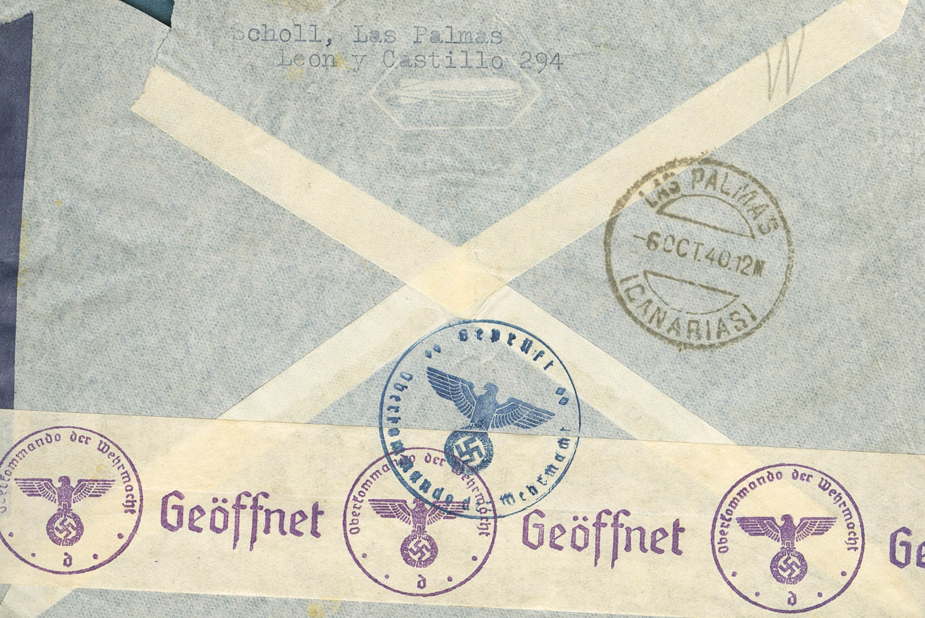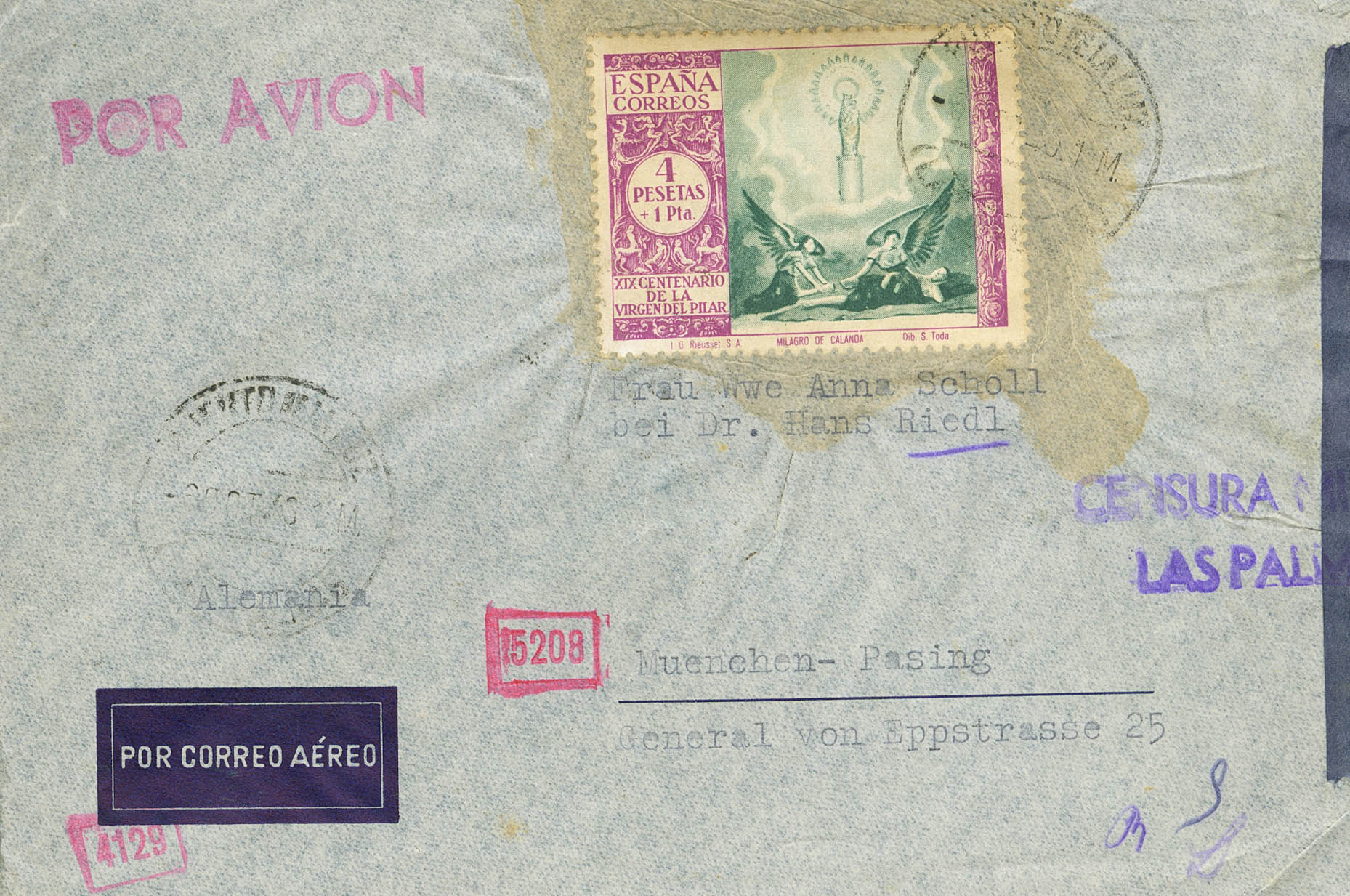 902. 1944. 4 pts + 1 pts lila y verde. Correo Aéreo PUERTO DE LA LUZ (LAS PALMAS) a PASING-OBERMENZING (ALEMANIA). En el frente llegadas. MAGNIFICA.