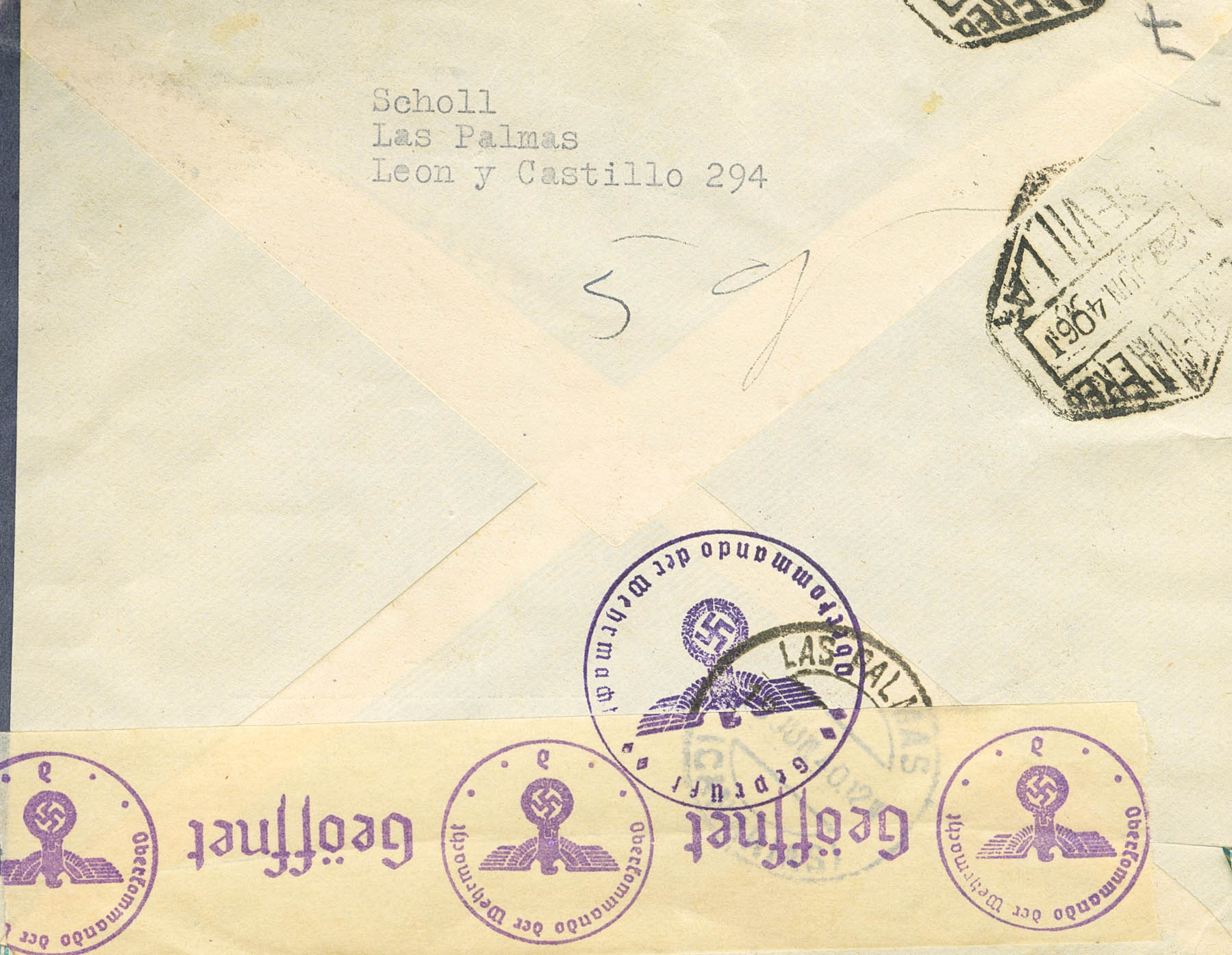 902. 1944. 4 pts + 1 pts lila y verde. Correo Aéreo PUERTO DE LA LUZ (LAS PALMAS) a PASING-OBERMENZING (ALEMANIA). En el frente llegadas. MAGNIFICA Y RARA.