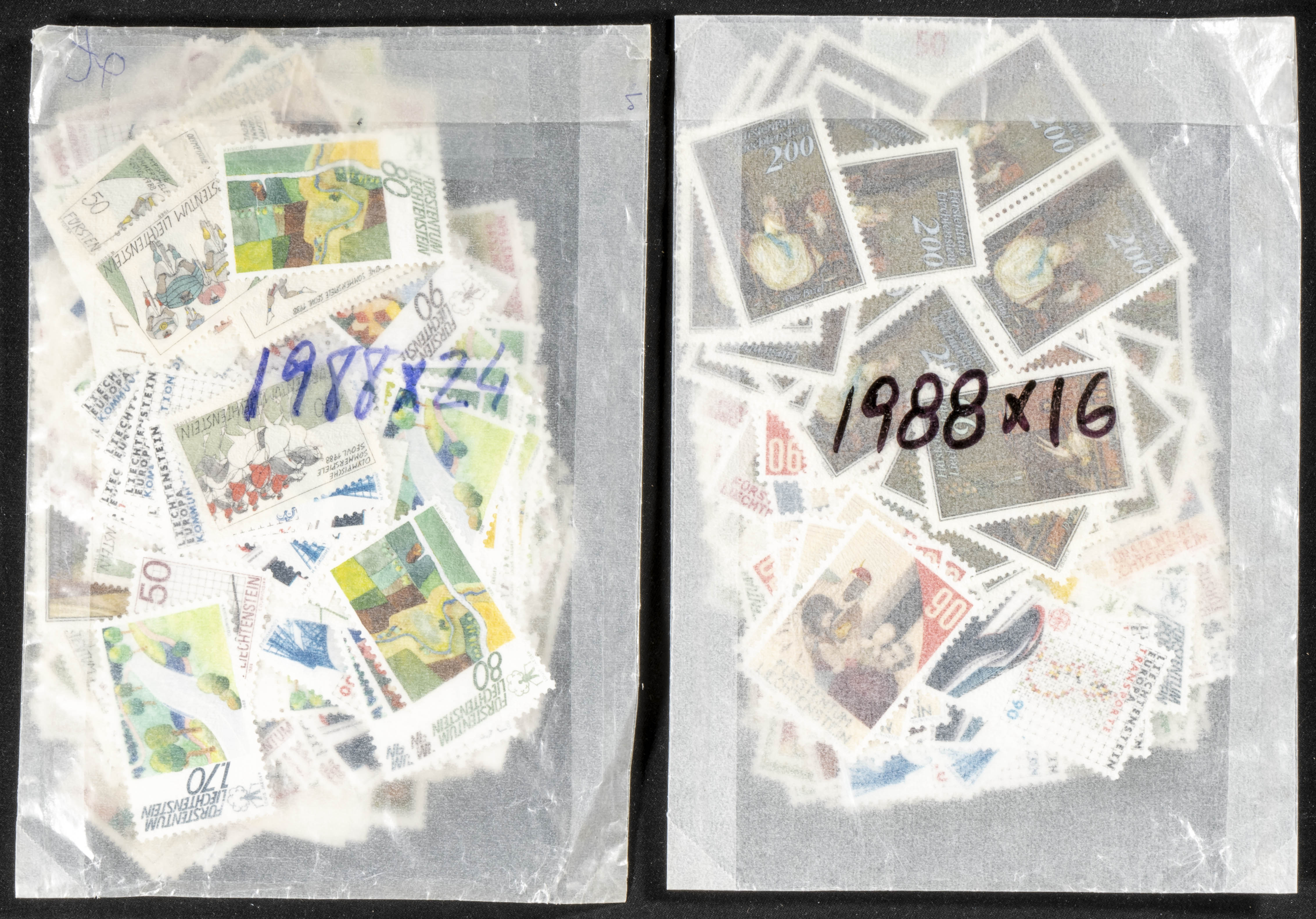 ★★Yvert 878/00(40). 1988. Conjunto de cuarenta años completos de 1988 (excepto sellos de hoja bloque) de Liechtenstein (en sobres mezclados). A EXAMINAR. Yvert 2019: 1.480 Euros