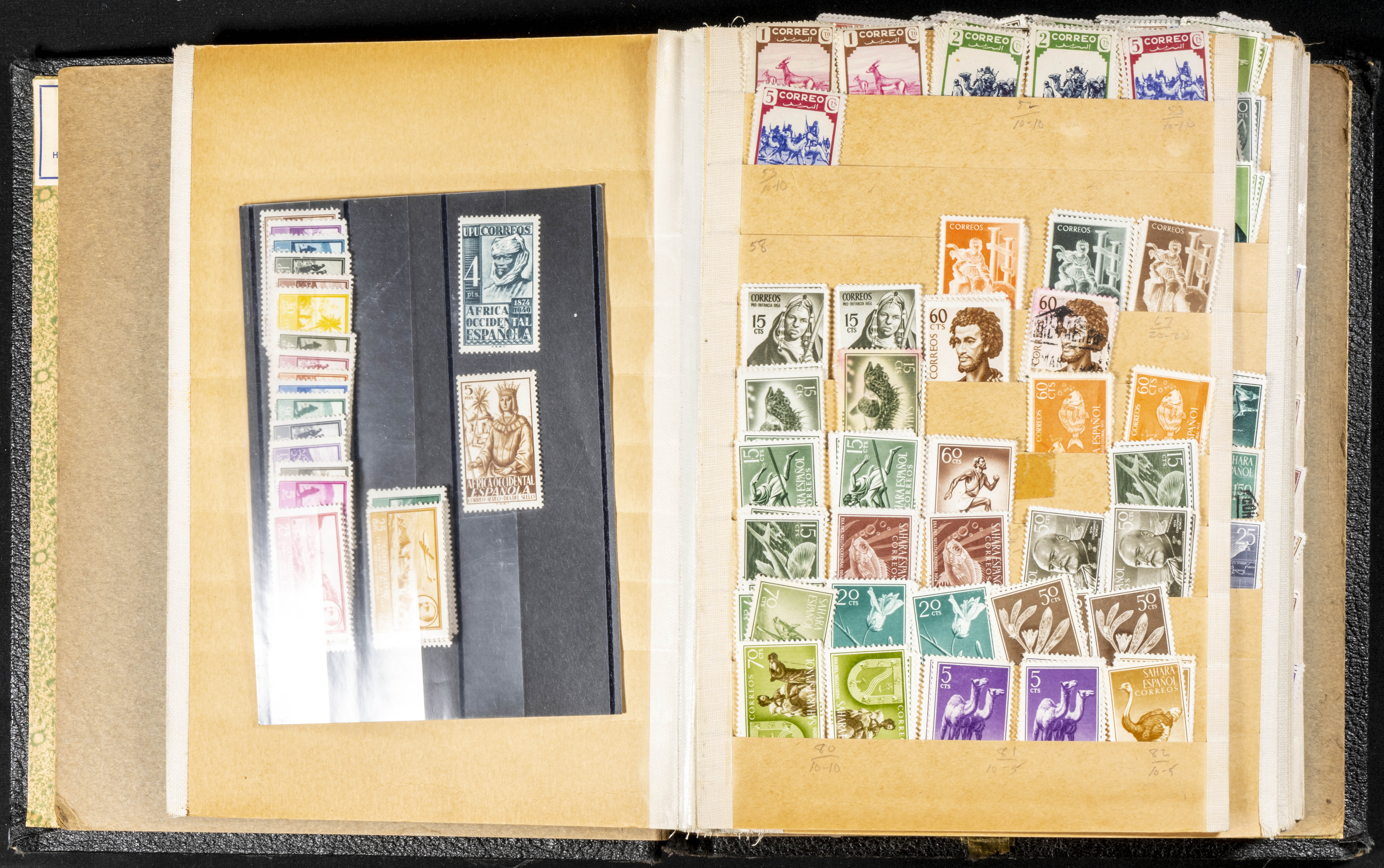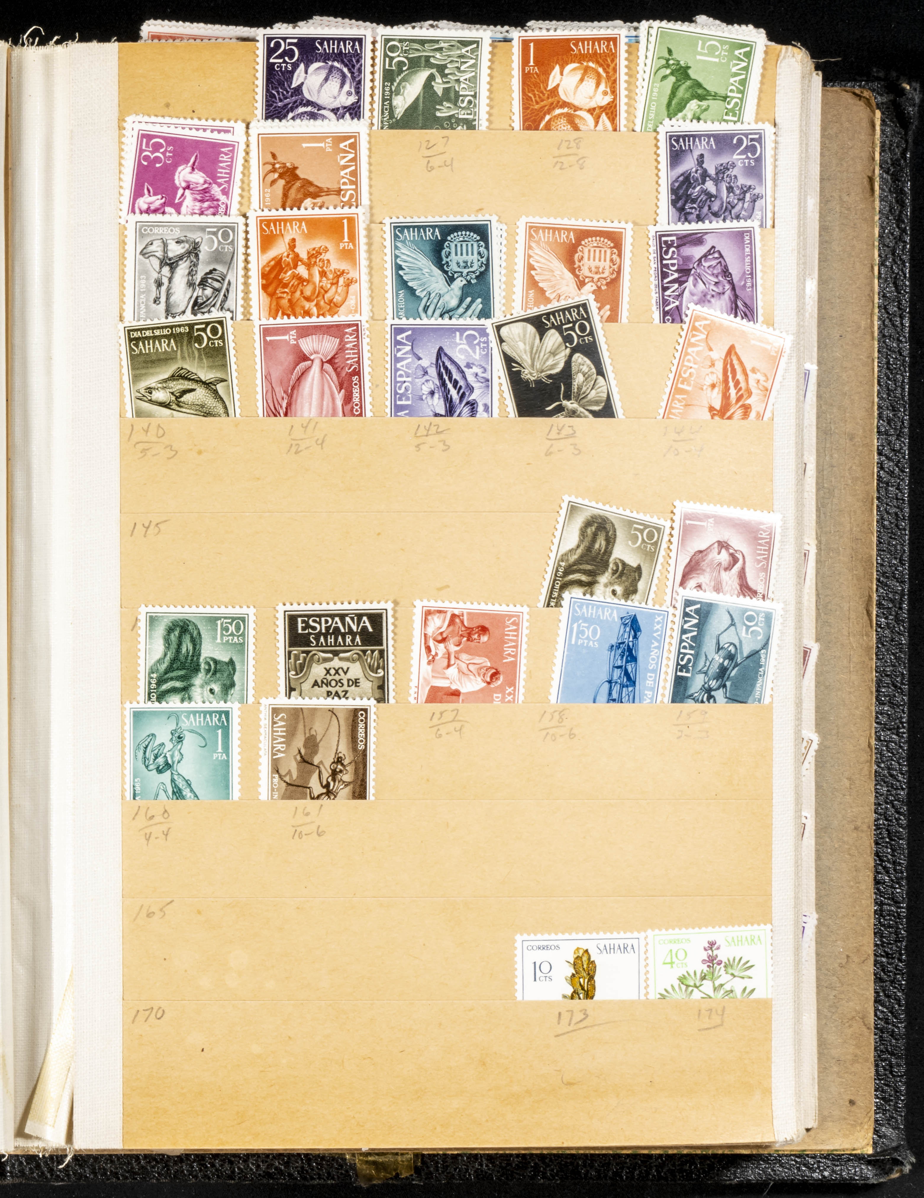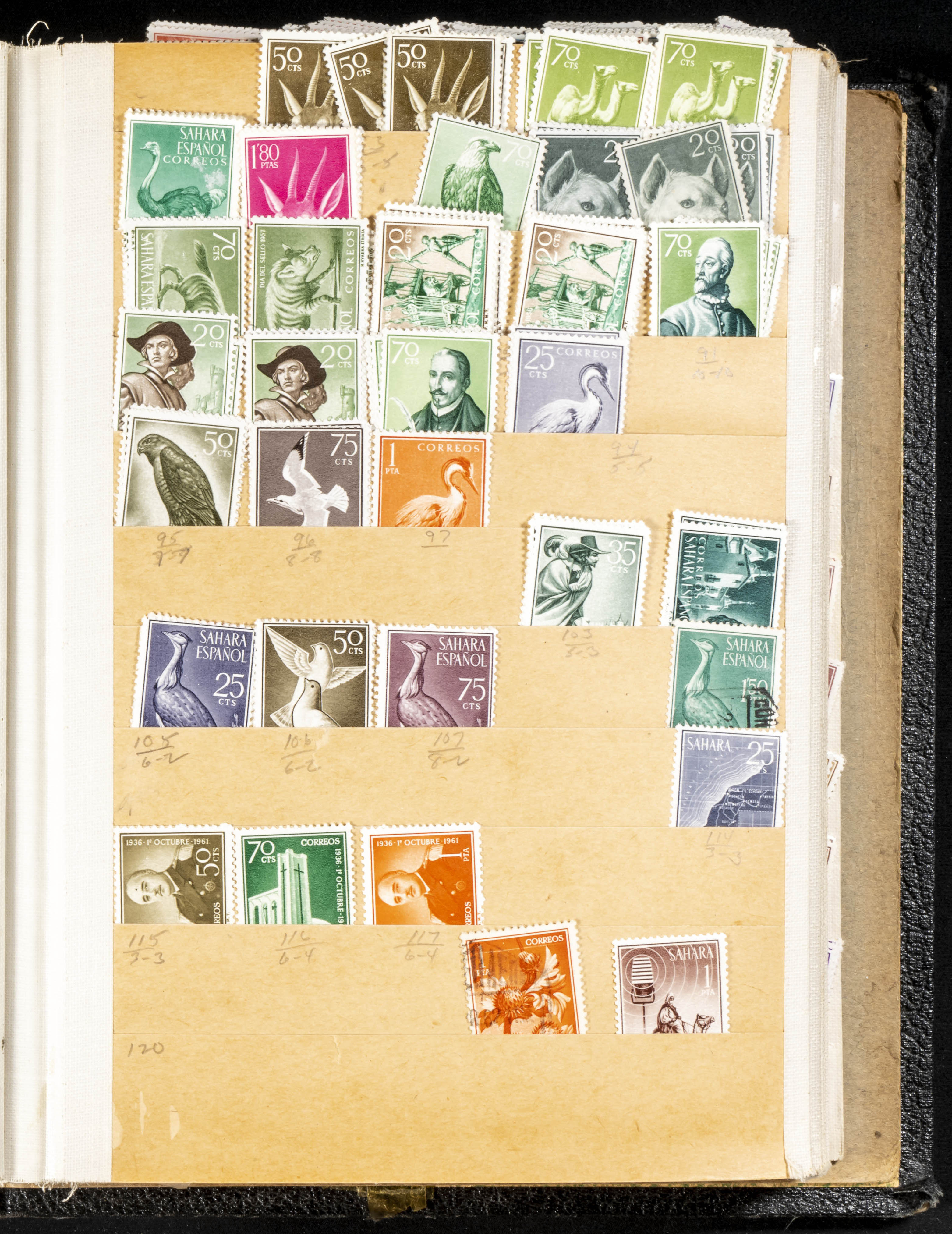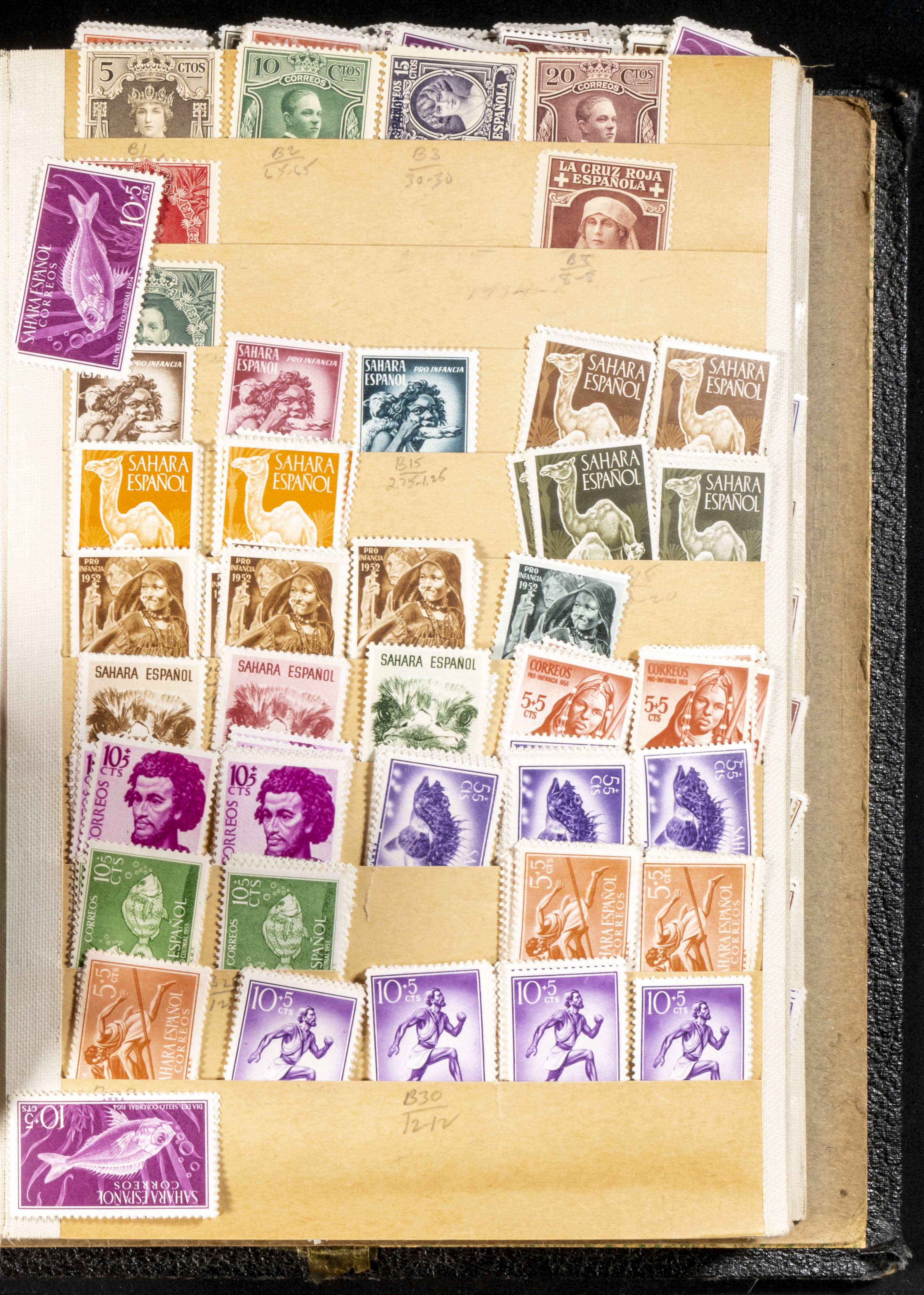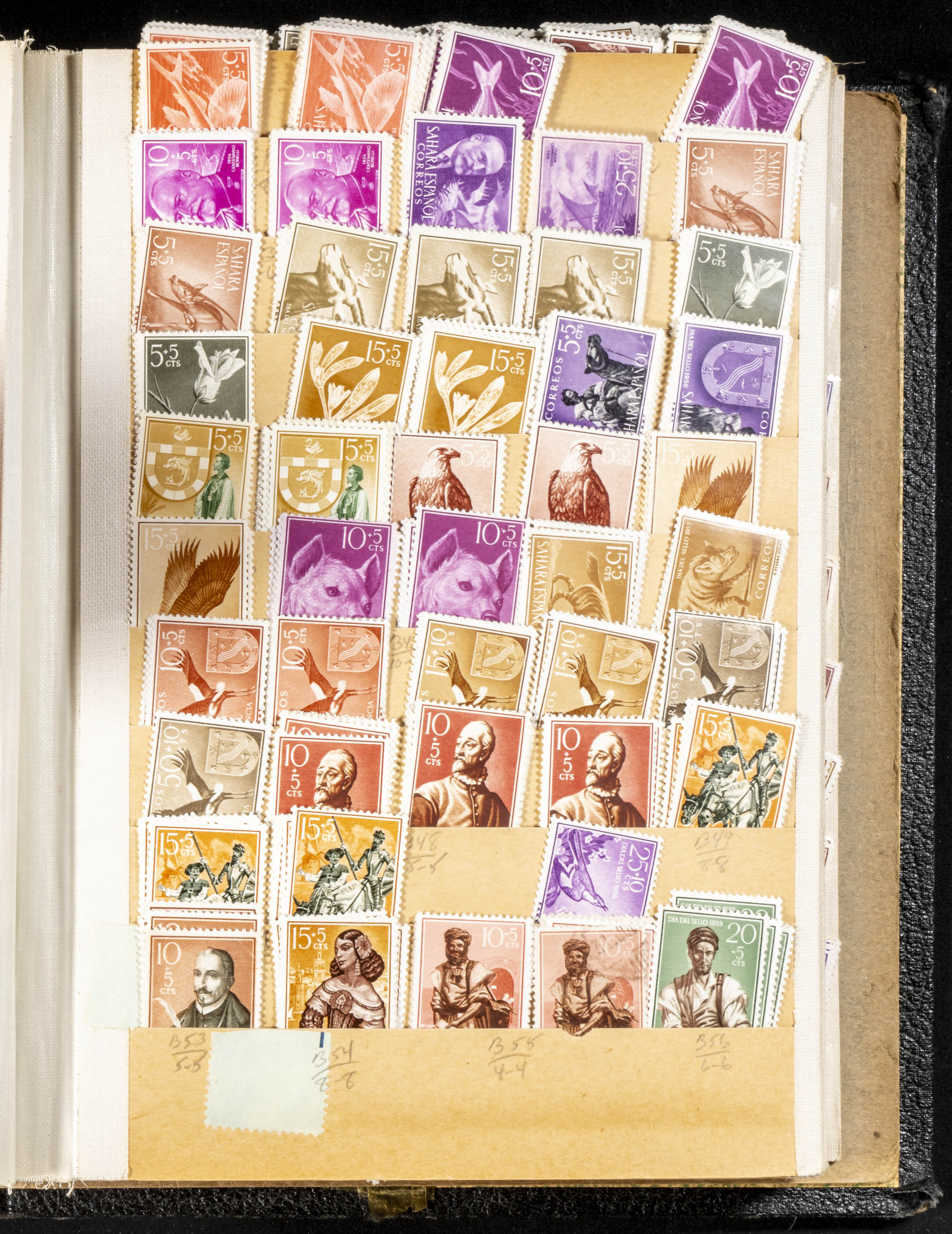 ★★(1877ca). Interesante conjunto de sellos sueltos y series completas de Colonias Españolas entre 1877 y 1967, en nuevo (mayoría) y usado, la mayoría Ex-Colonias de Africa, incluye varias hojas con emisiones de Filipinas entre 1878 y 1899 con algún fiscal. ALTO VALOR DE CATALOGO. A EXAMINAR.