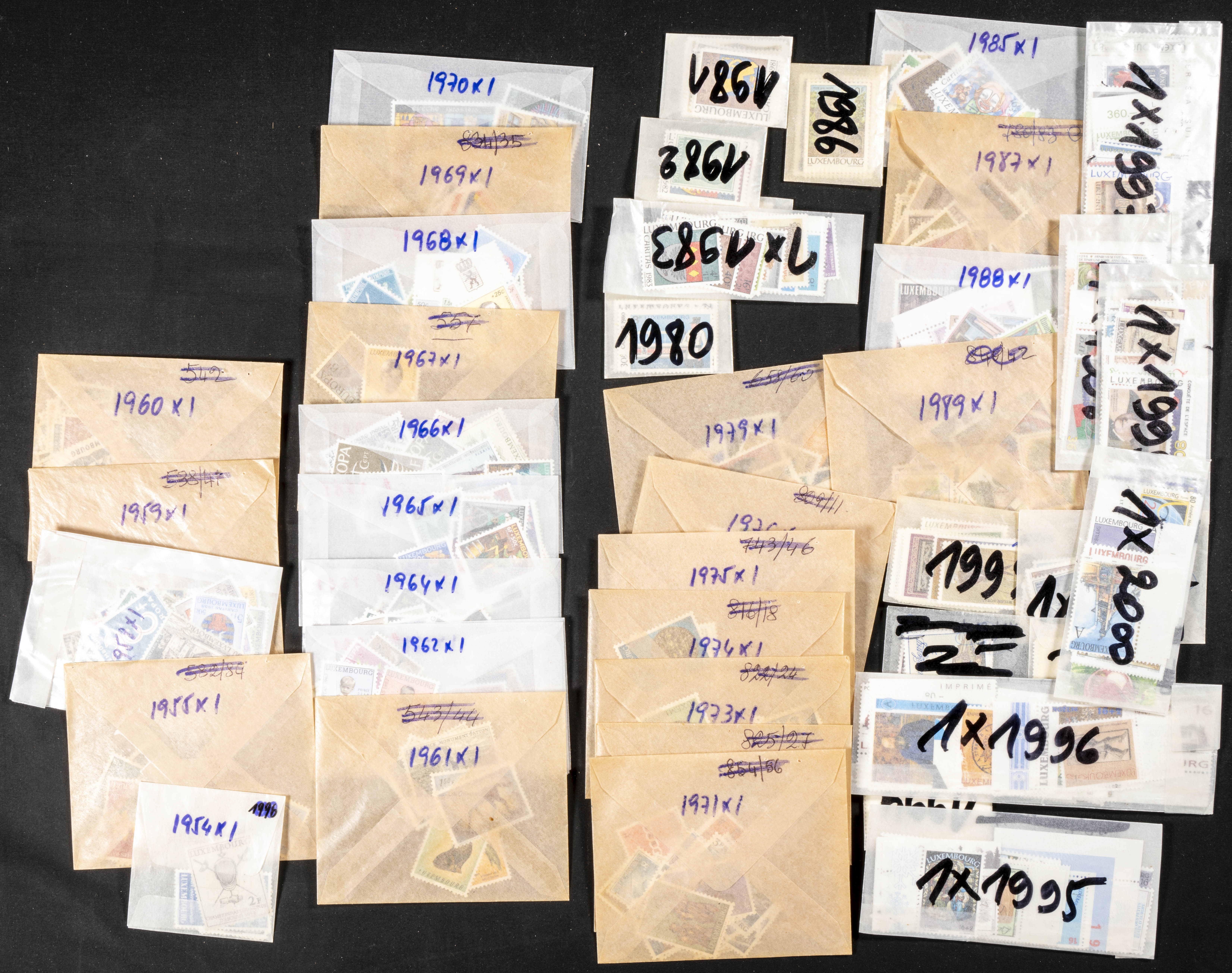 ★★(1954ca). Colección de Luxemburgo entre 1954 y 2000 (sin 1956 y 1957), en nuevo y a falta de aéreos y sellos de hojas bloque (montada por años en sobres de cristal). A EXAMINAR. Yvert 2023: +1.500 Euros