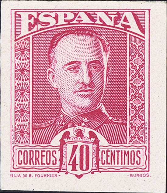 (★)(1940ca). 40 cts rosa. ENSAYO DE COLOR y SIN DENTAR, de un diseño no adoptado, sobre papel satinado, con la efigie de Franco y realizado por Fournier. MAGNIFICO Y RARO.