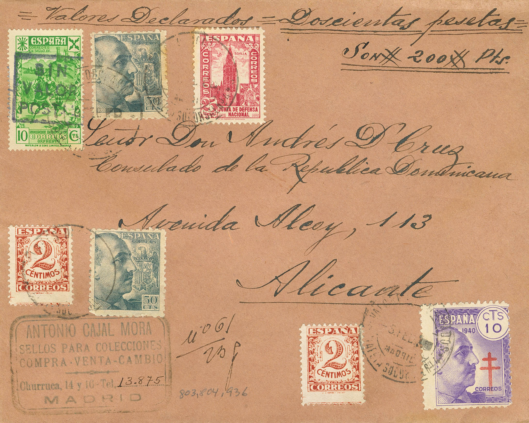925(2). (1936ca). 50 cts gris, dos sellos, diversos valores. Valores Declarados de MADRID a ALICANTE. MAGNIFICA.