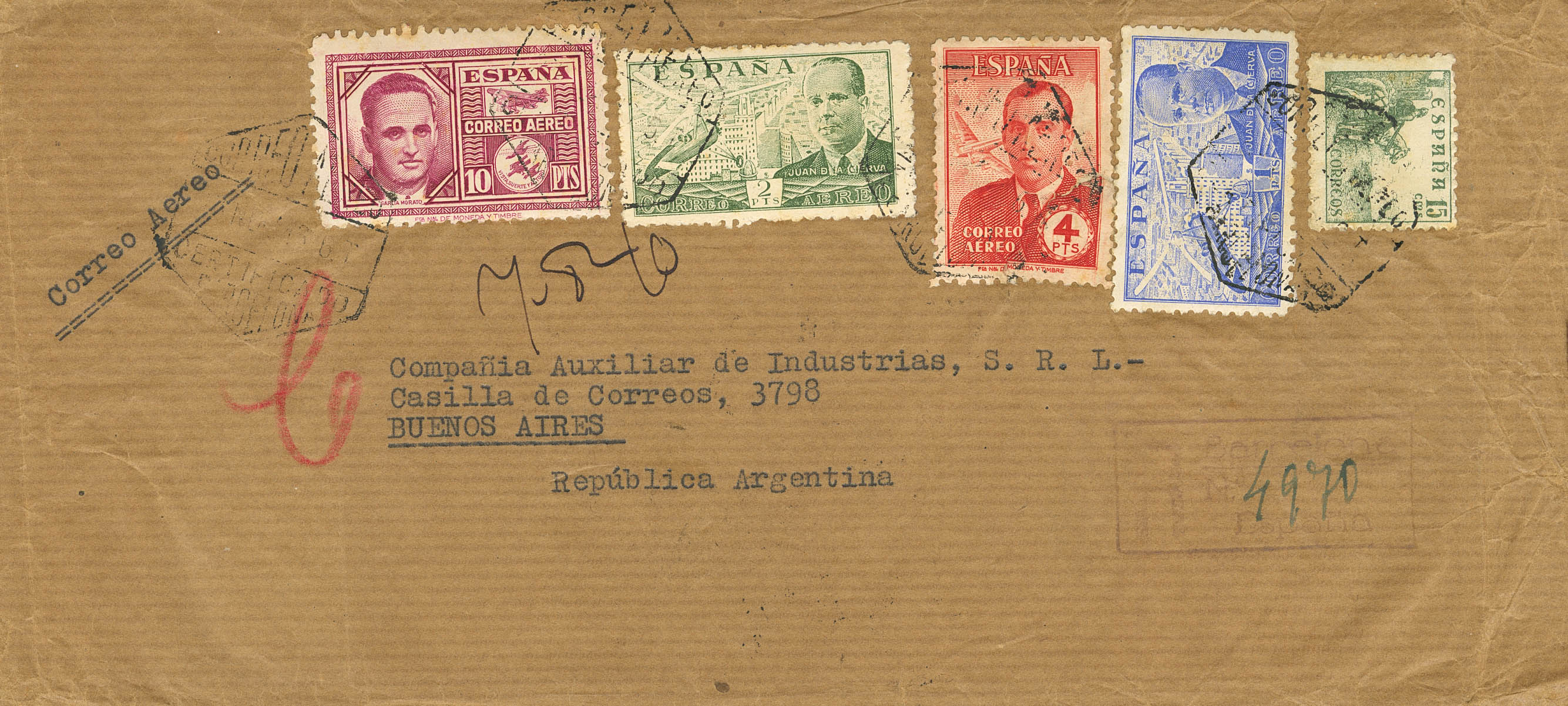991/92. 1946. Serie completa, 1 pts azul, 2 pts verde y 15 cts verde. Certificado de BARCELONA a BUENOS AIRES (ARGENTINA). Al dorso llegada. MAGNIFICA.