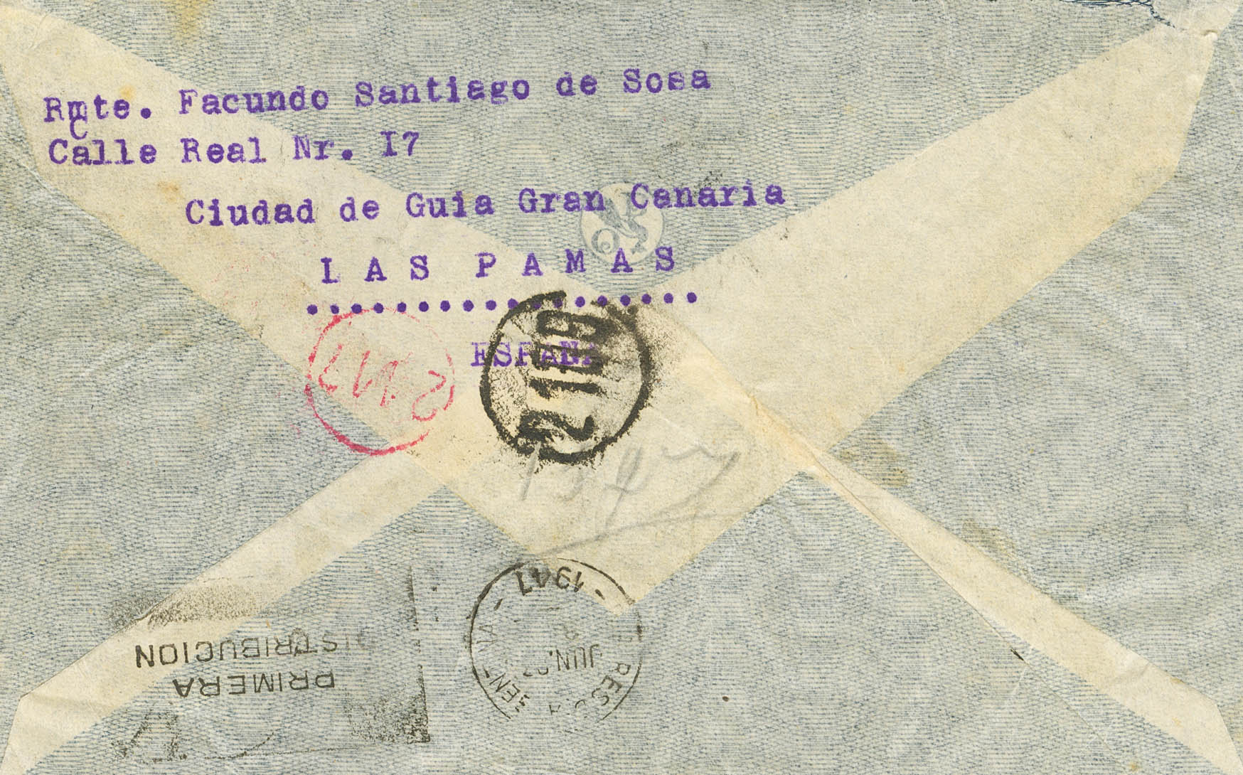 1003, 927(2), 930. 1947. 75 cts azul y diversos valores. SANTA MARIA DE GUIA (GRAN CANARIA) a BUENOS AIRES (ARGENTINA), dirigida a Juan Domingo Perón, presidente de Argentina. Matasello GUIA / (CANARIAS) y al dorso llegada. MAGNIFICA.