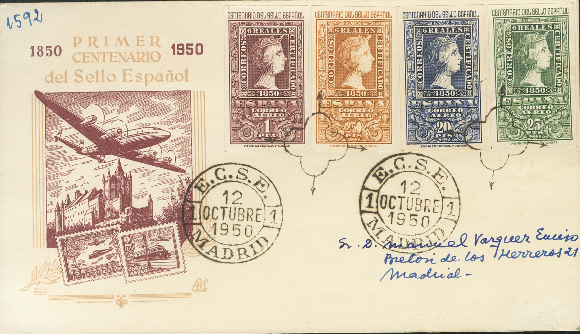 1075/82. 1950. Serie completa, en dos sobres de Primer Día. Correo Interior de MADRID. Al dorso llegadas. MAGNIFICOS.