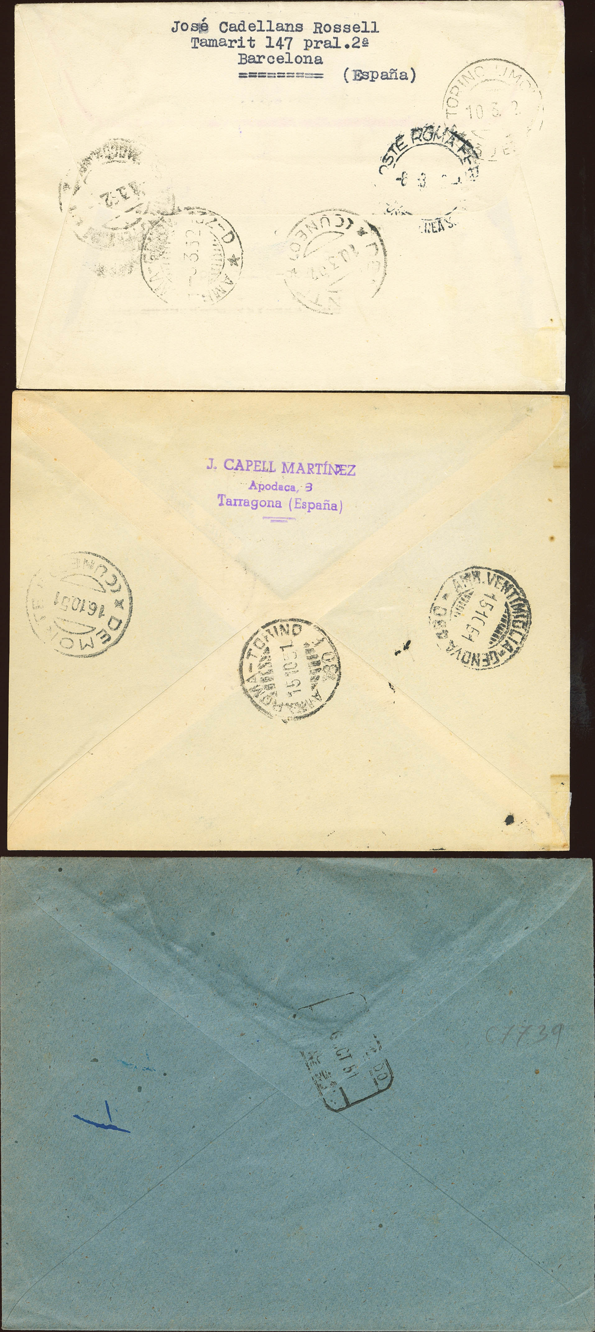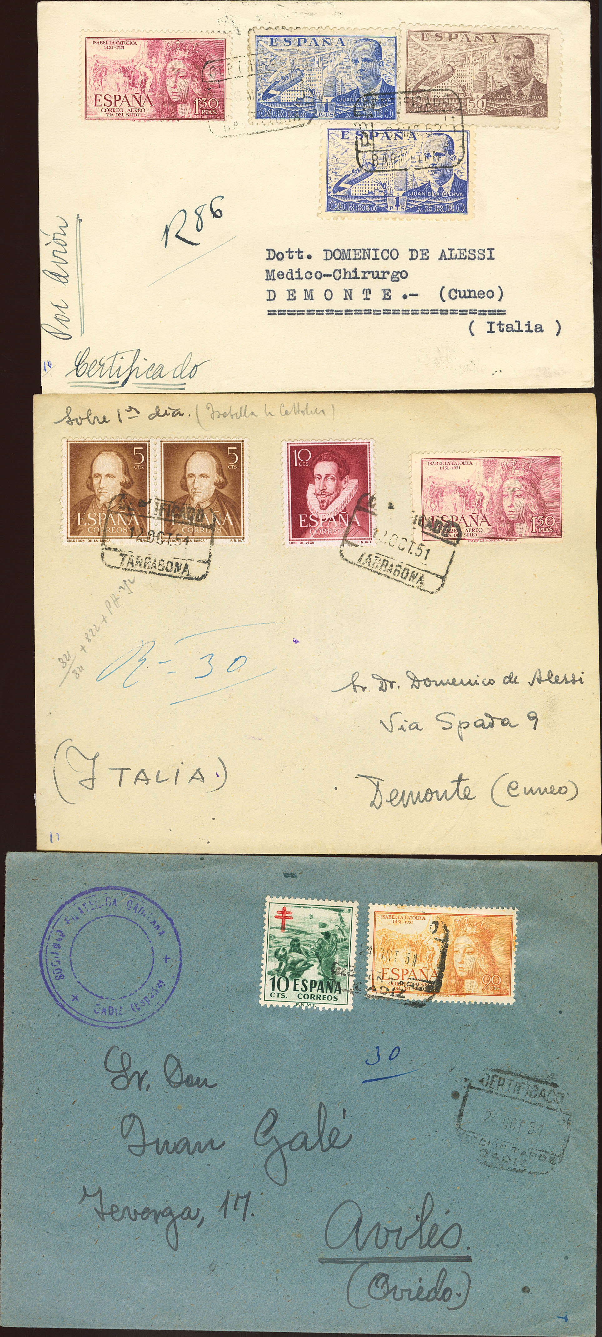 1098, 1099. 1951. Tres cartas dirigidas a OVIEDO e ITALIA (2) franqueadas con sellos de Isabel aéreos de 1951. MAGNIFICAS.
