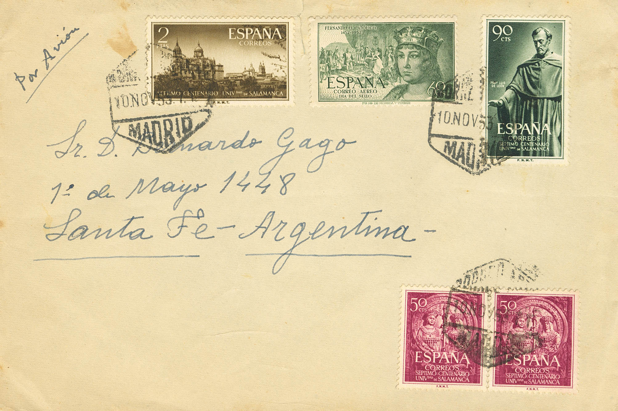 1126/28, 1111. 1955. Serie completa y 60 cts verde. MADRID a SANTA FE (ARGENTINA). Al dorso llegada. MAGNIFICA.