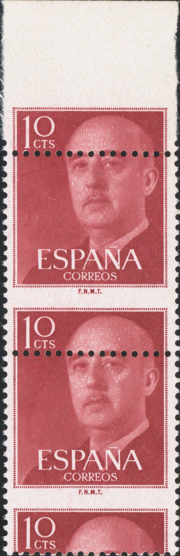 ★★ 1143dv(2). 1955. 10 cts rojo burdeos, pareja, borde de hoja. DENTADO HORIZONTAL DESPLAZADO. MAGNIFICA. Edifil 2021: +60 Euros