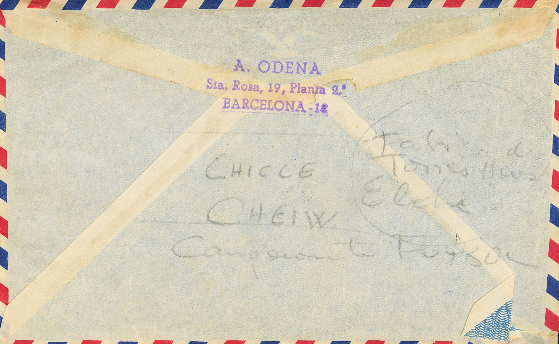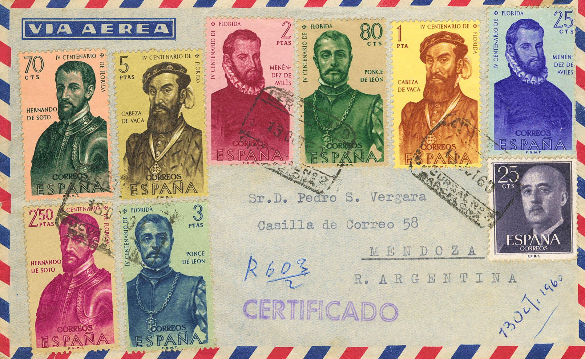 1298/05. 1960. Serie completa y 25 cts azul violeta. Certificado de BARCELONA a MENDOZA (ARGENTINA). MAGNIFICA.