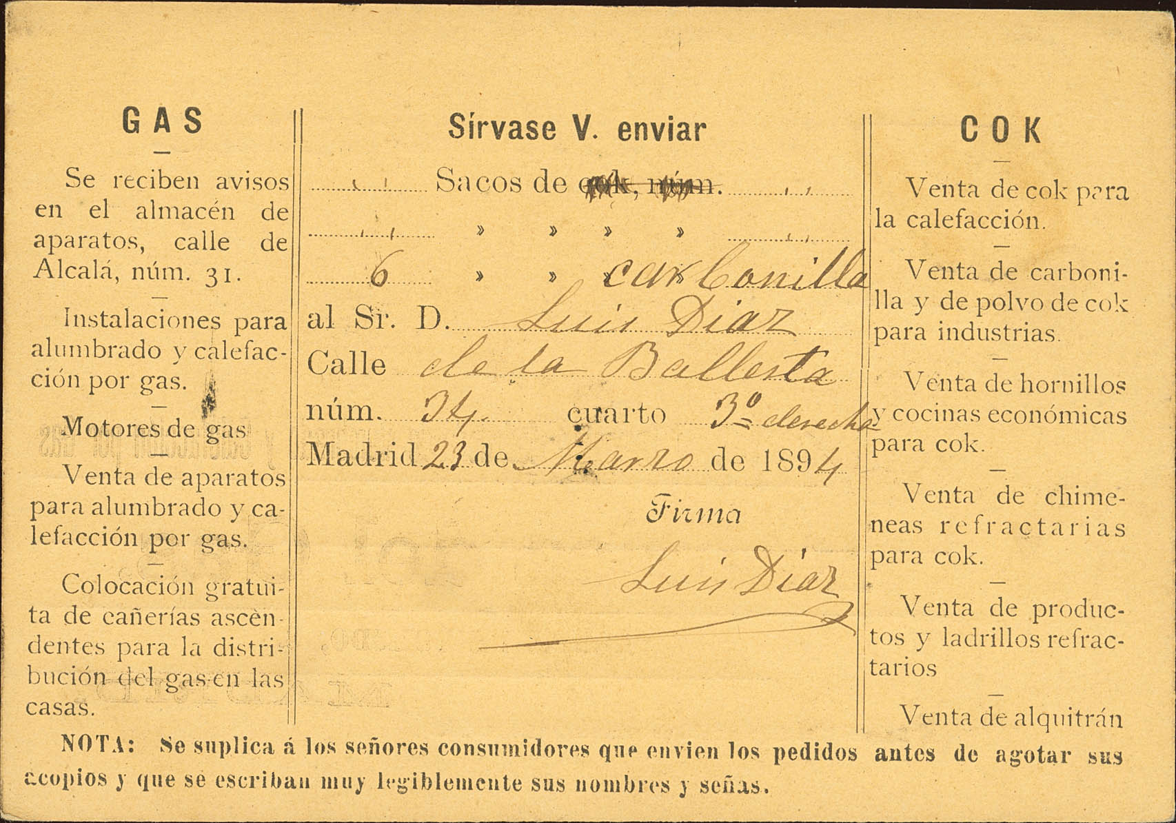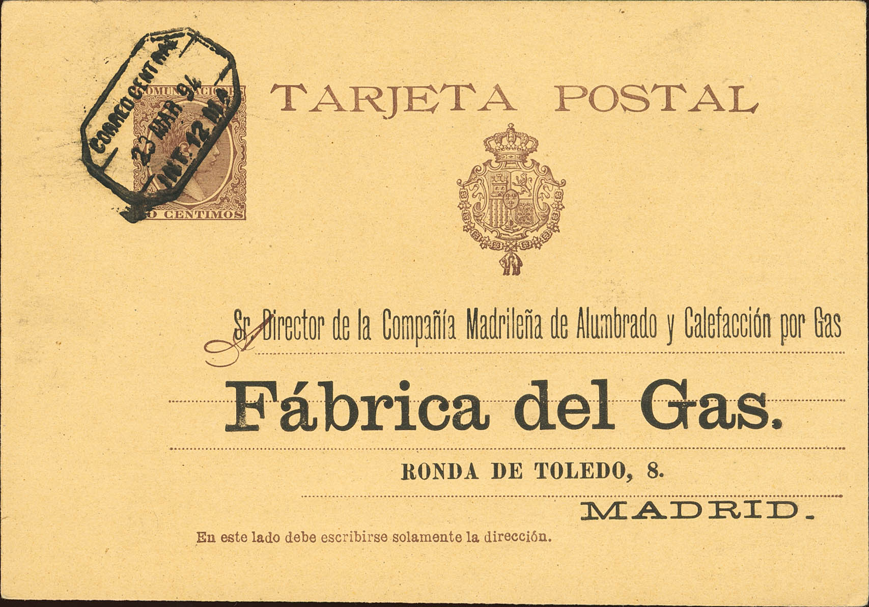 EP27ipb. 1894. 10 cts castaño sobre Tarjeta Entero Postal con sobreimpresión privada COMPAÑIA MADRILEÑA DE ALUMBRADO Correo Interior de MADRID. MAGNIFICA.