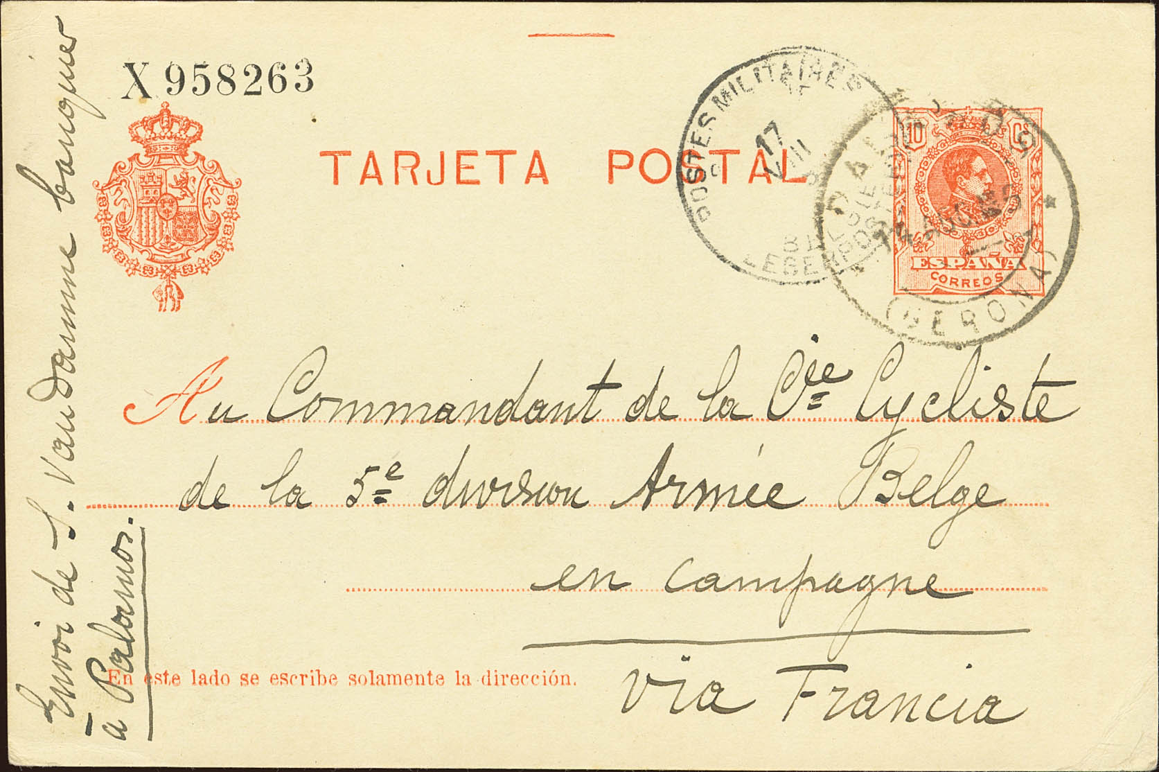 EP49. 1917. 10 cts naranja sobre Tarjeta Entero Postal de PALAMOS a BELGICA, dirigida al comandante de una compañía ciclista en campaña durante la I Guerra Mundial. Matasello PALAMOS / (GERONA) y fechador de llegada POSTES MILITAIRES / BELGIE / LEGERPOSTERIJ. MAGNIFICA Y MUY RARA DIRIGIDA A BELGICA, OCUPADA POR ALEMANIA DURANTE LA I GUERRA MUNDIAL.