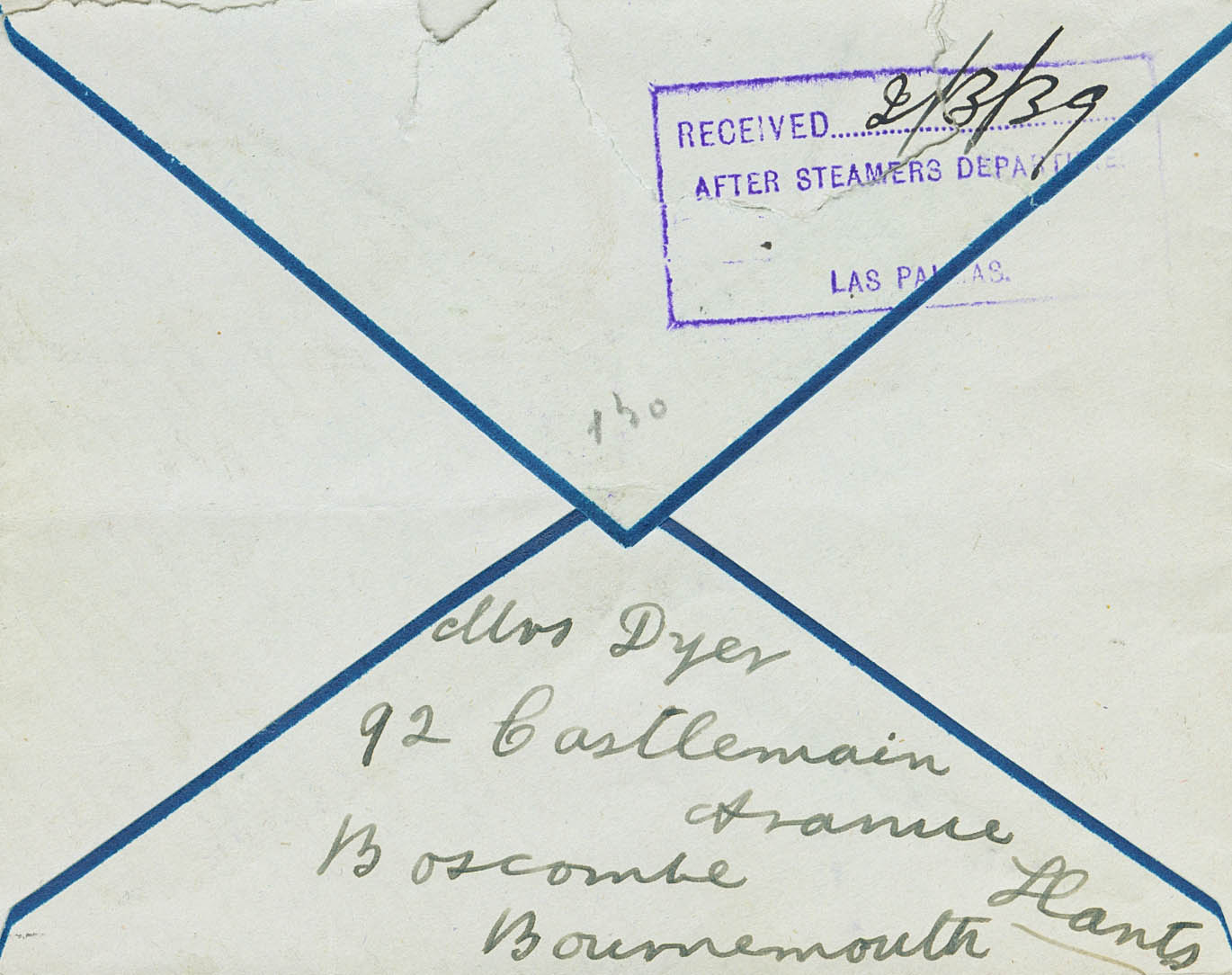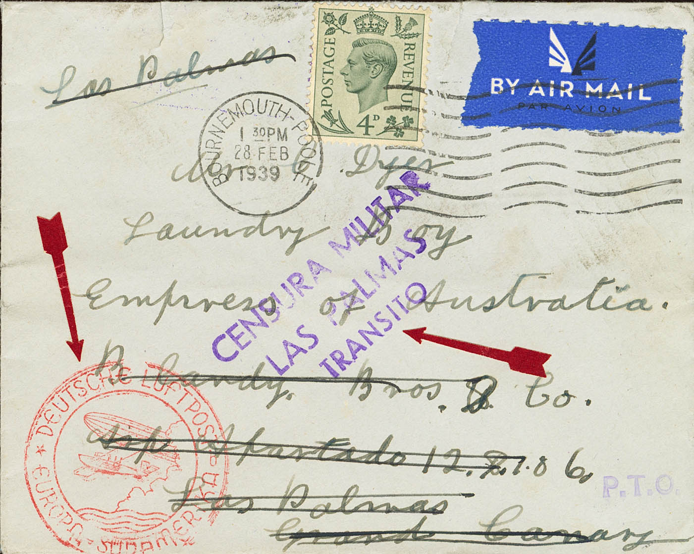 1939. 4 p verde gris de Gran Bretaña. BOURNEMOUTH-POOLE (GRAN BRETAÑA) a LAS PALMAS, devuelta al remitente. En el frente CENSURA MILITAR / LAS PALMAS / TRANSITO, en violeta y marca DEUTSCHE LUFTPOST / EUROPA-SUDAMERICA, en rojo, el Administrador de Correos de las Palmas con autorización de la Junta de Defensa Nacional toma la iniciativa de restablecer las líneas aeropostales con Lufthansa, utilizando la línea Europa-Sudamérica para este fin, al dorso marca en violeta RECEIVED... / AFTER STEAMERS DEPARTURE / LAS PALMAS. MAGNIFICA Y RARA.
