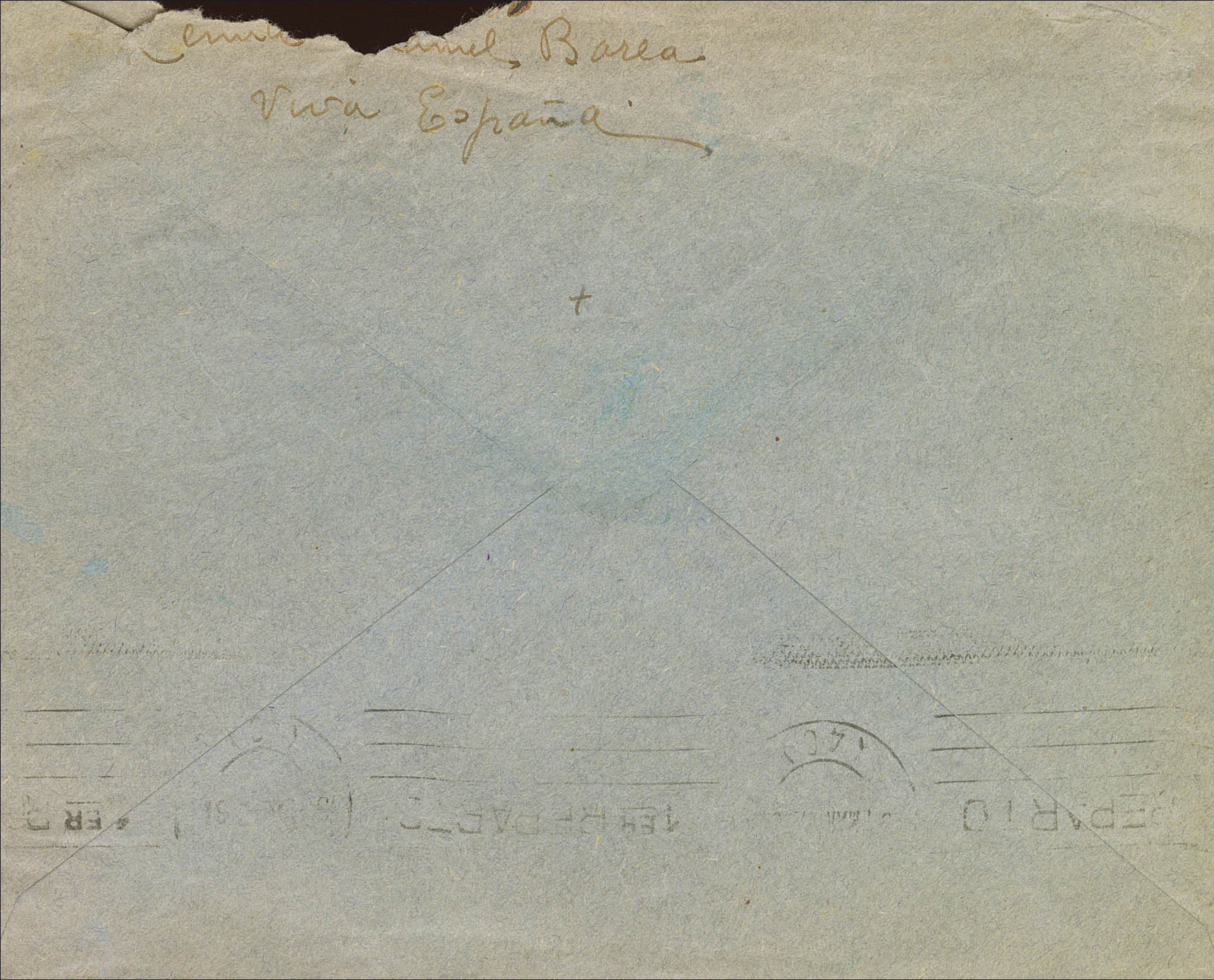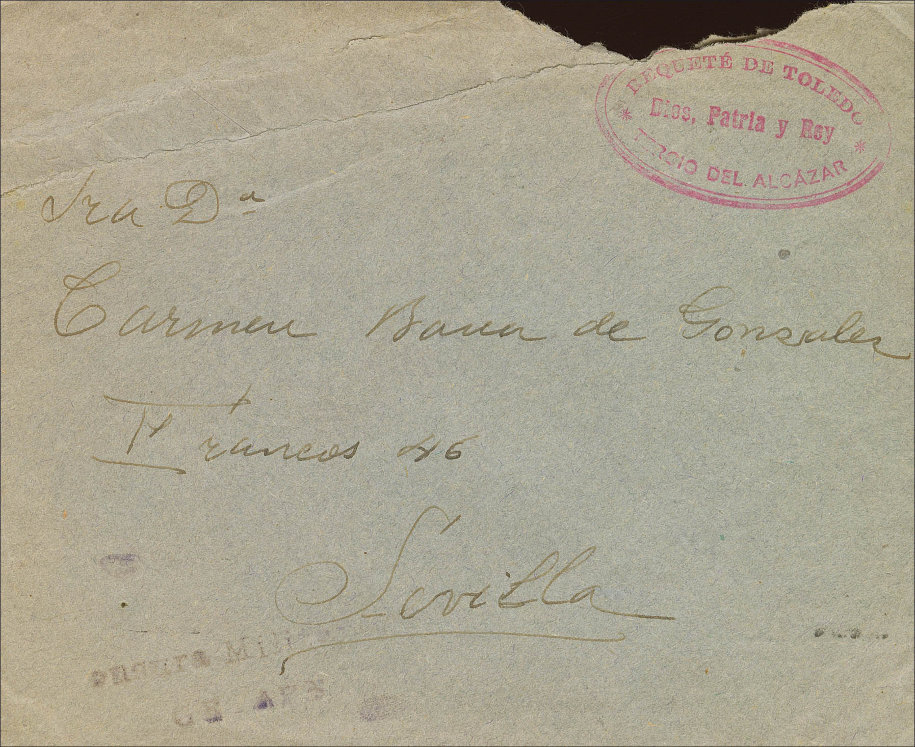 1937. GETAFE (MADRID) a SEVILLA (rasgada en la parte superior). Marcas REQUETE DE TOLEDO / DIOS PATRIA Y REY / TERCIO DEL ALCAZAR, en carmín y CENSURA MILITAR / GETAFE, en azul. BONITA Y RARISIMA.