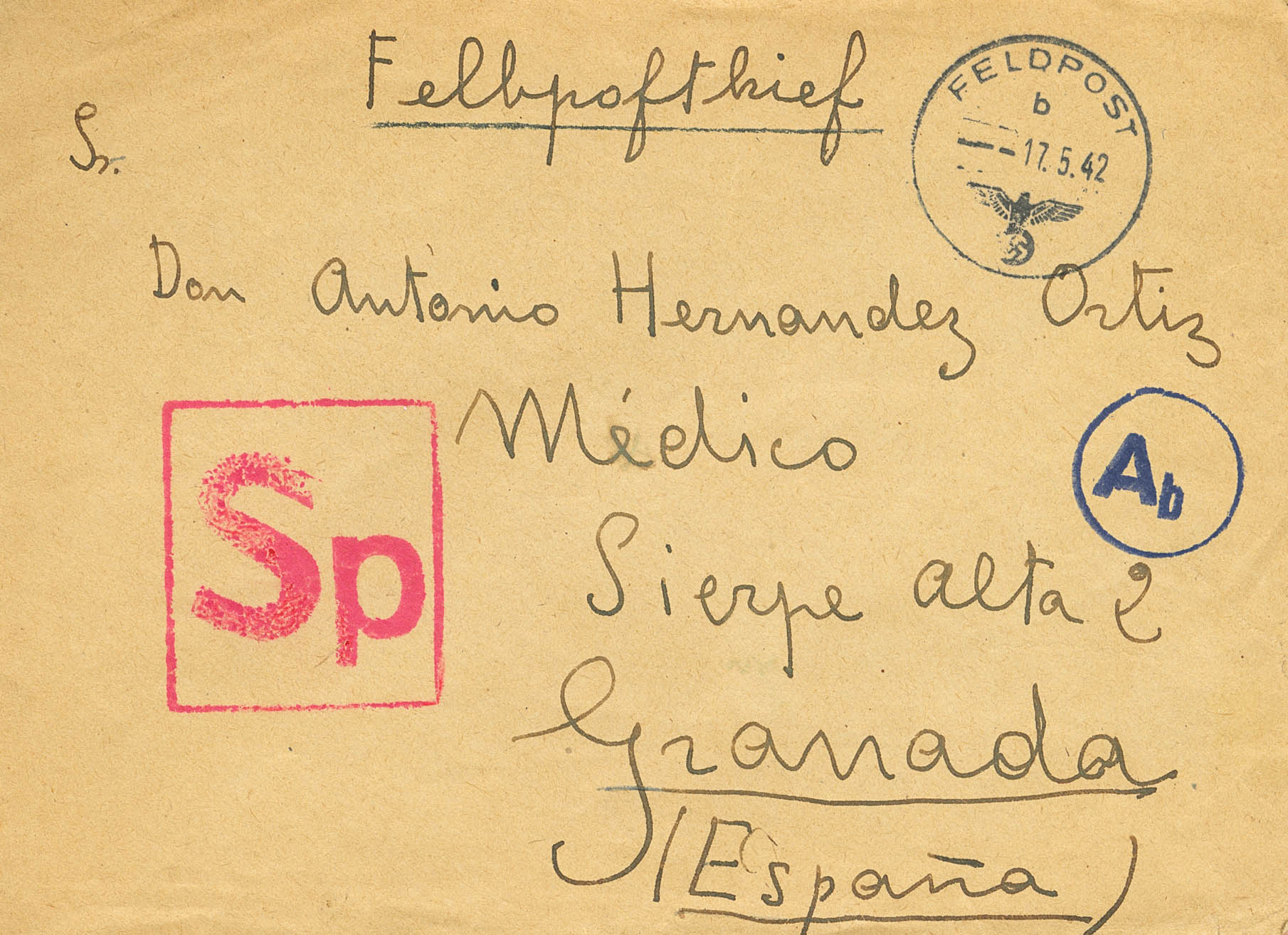 1942. (17 Mayo). Feldpost Nº00198-D (Jefatura de la División) a GRANADA. Fechador FELDPOST / B y marcas SP, en rojo (grande) y Ab, en azul. MAGNIFICA.