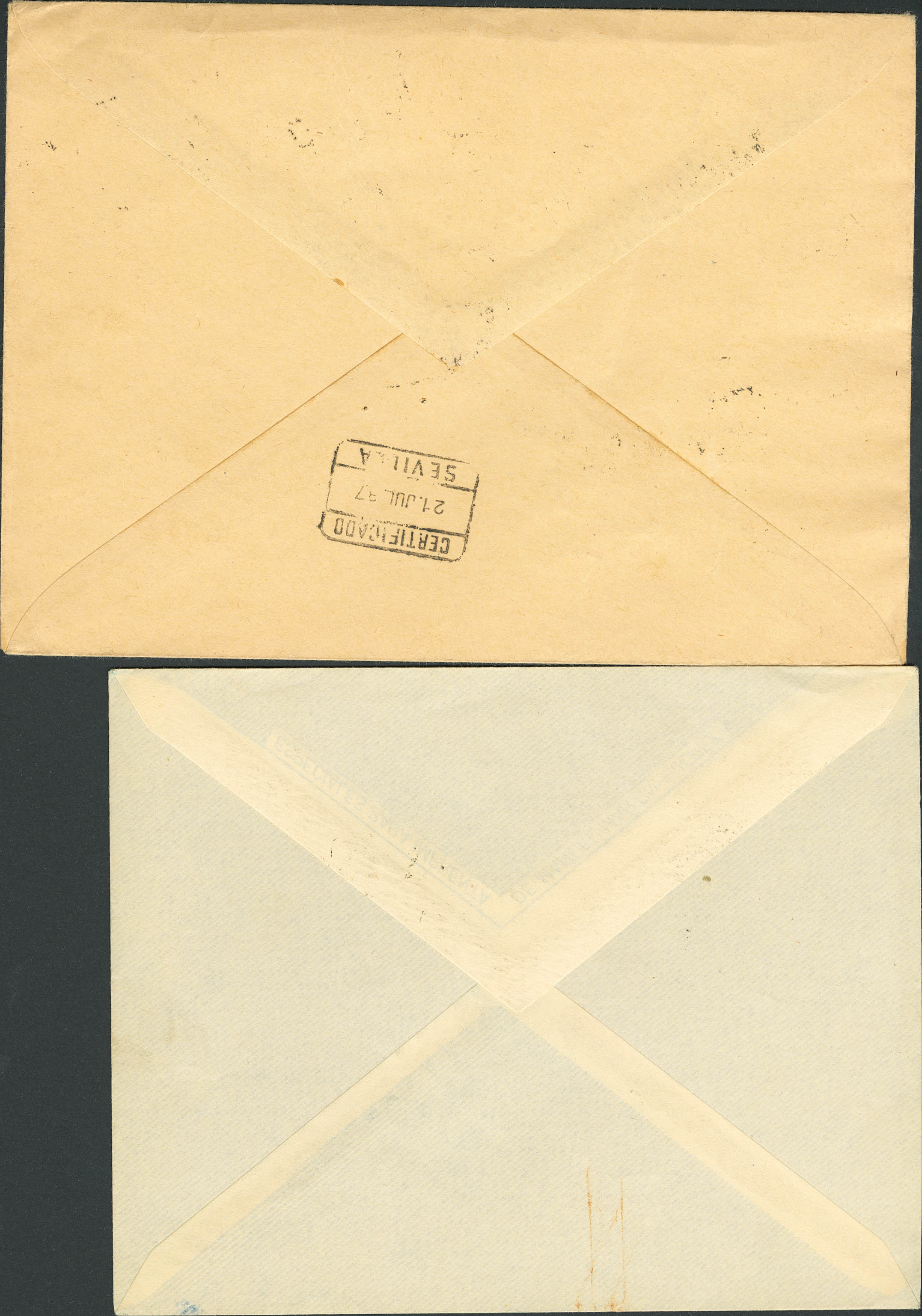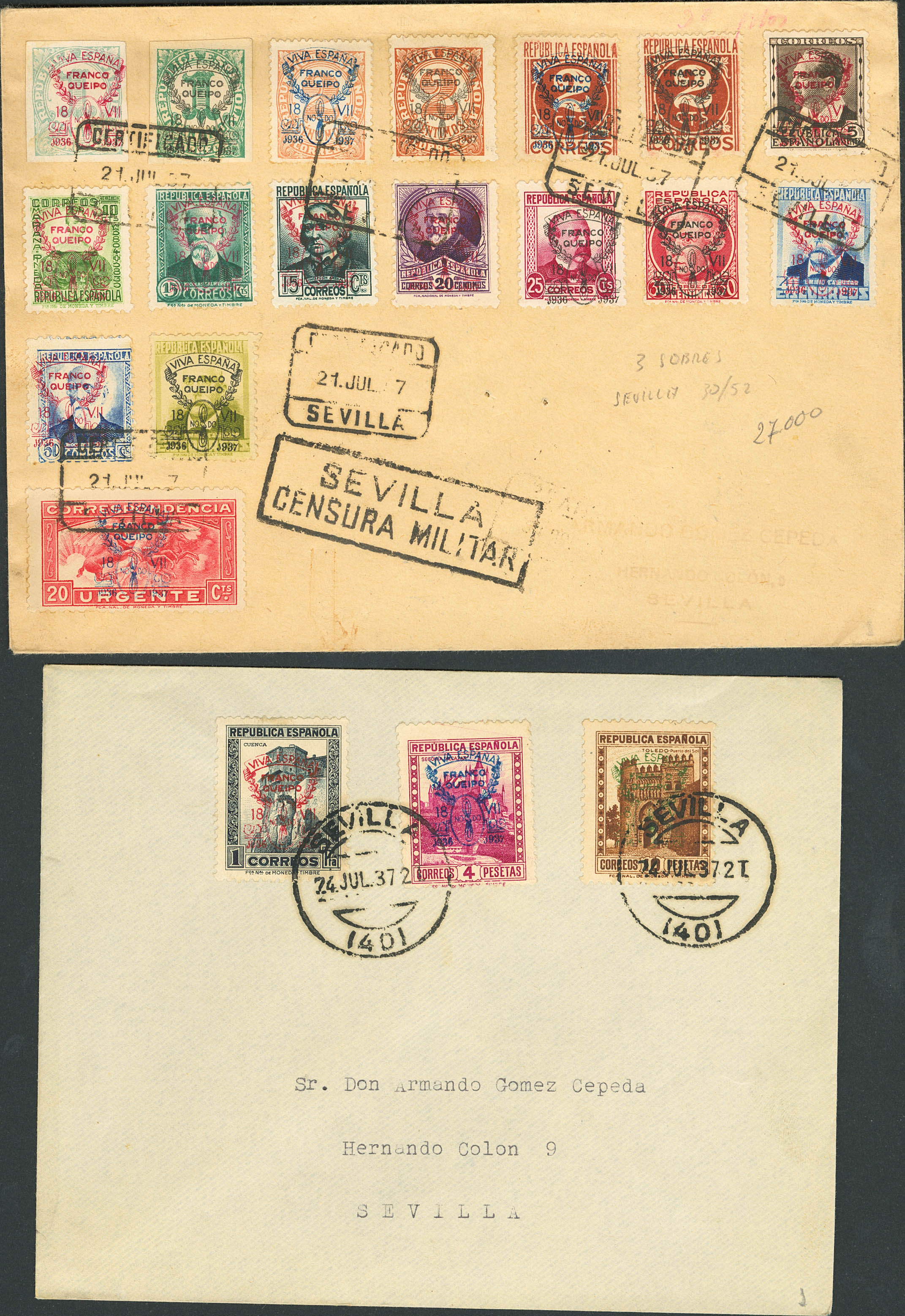 30/52. 1937. Serie completa en dos cartas circuladas por el Correo Interior de SEVILLA. MAGNIFICAS.