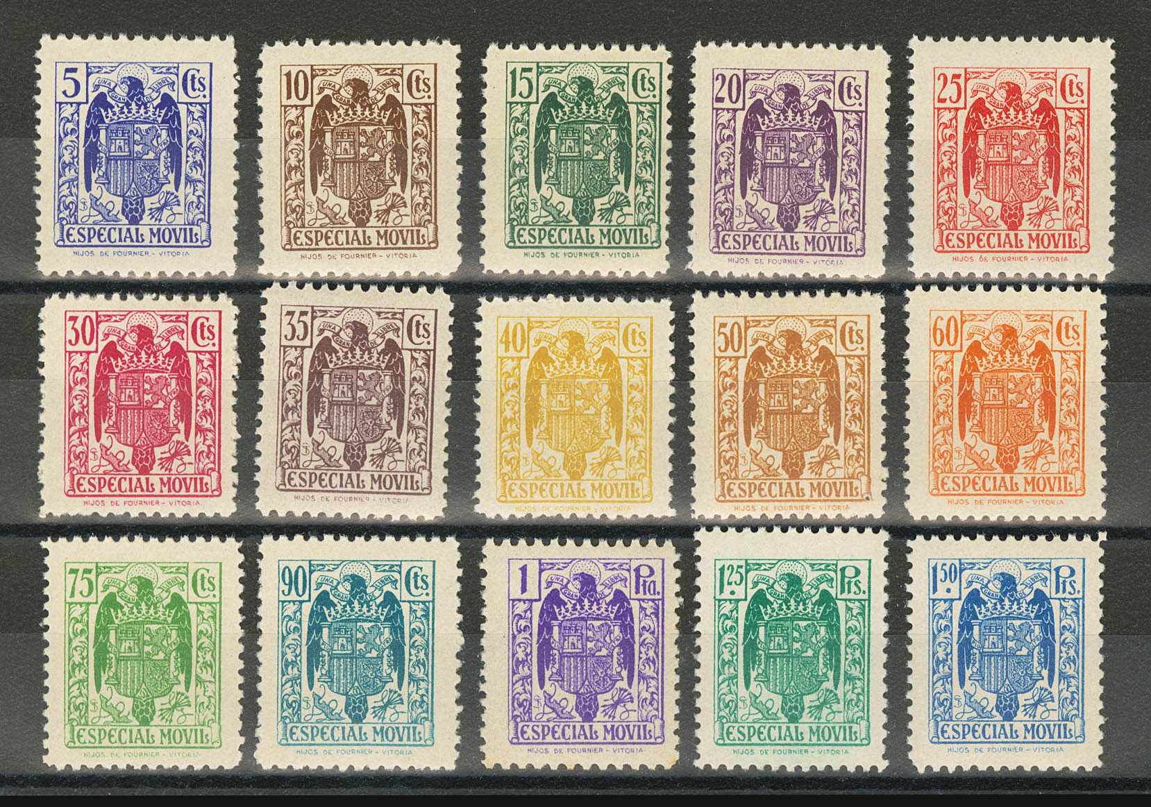 ★★1937. Serie completa, quince valores con pie de imprenta Hijos de Fournier-Vitoria. ESPECIAL MOVIL. MAGNIFICA Y RARA. (Alemany 81/95)
