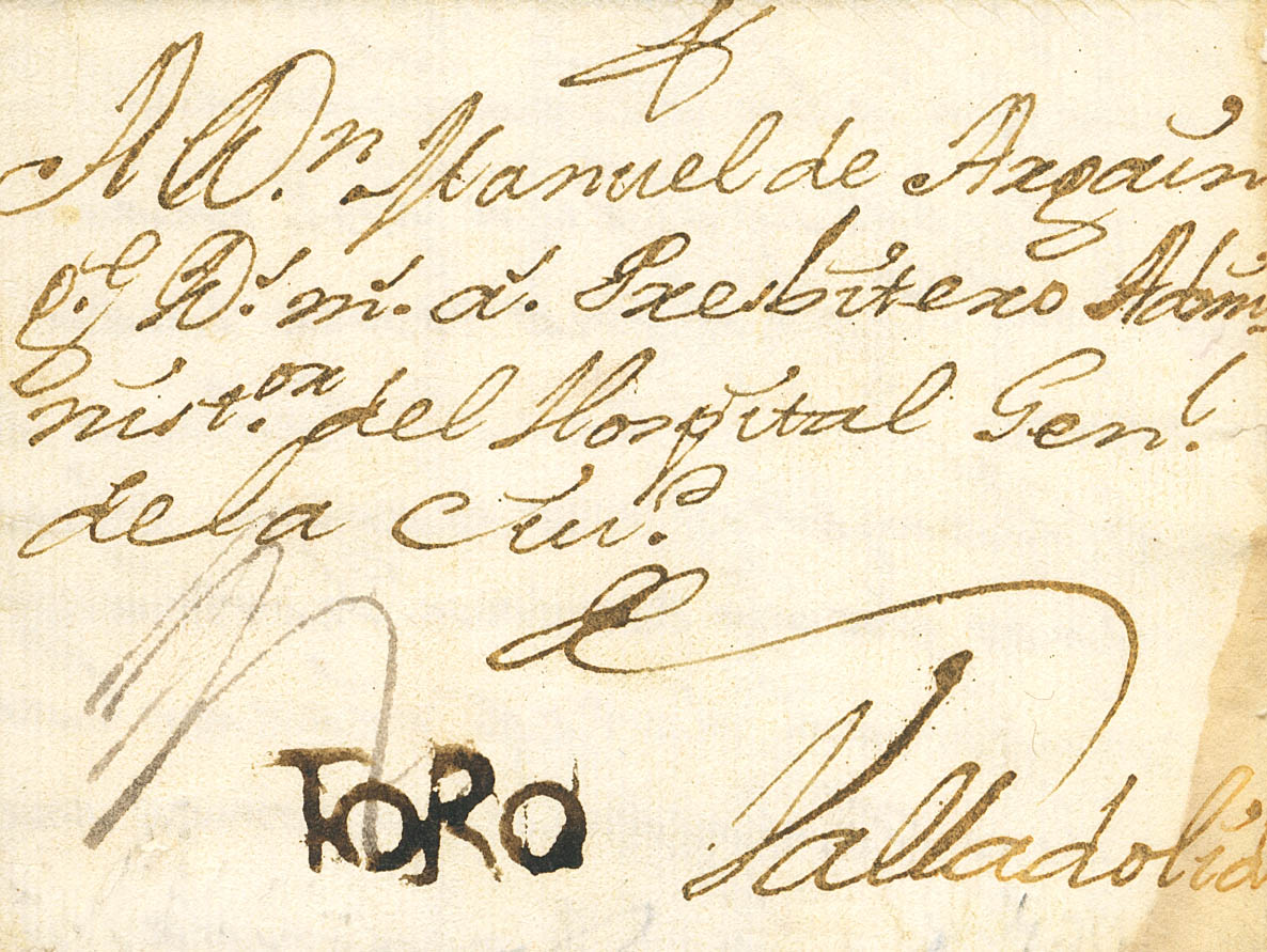 1745. TORO (ZAMORA) a VALLADOLID. Marca TORO, en tinta de escribir (P.E.1) edición 2004. MAGNIFICA Y RARISIMA, CASI CON TODA PROBABILIDAD SE TRATA DE LA MARCA MAS ANTIGUA UTILIZADA EN ESTA LOCALIDAD Y CON TODA SEGURIDAD ES LA RESEÑADA EN LA OBRA DE TIZON. Ex-Antonio Cuesta.