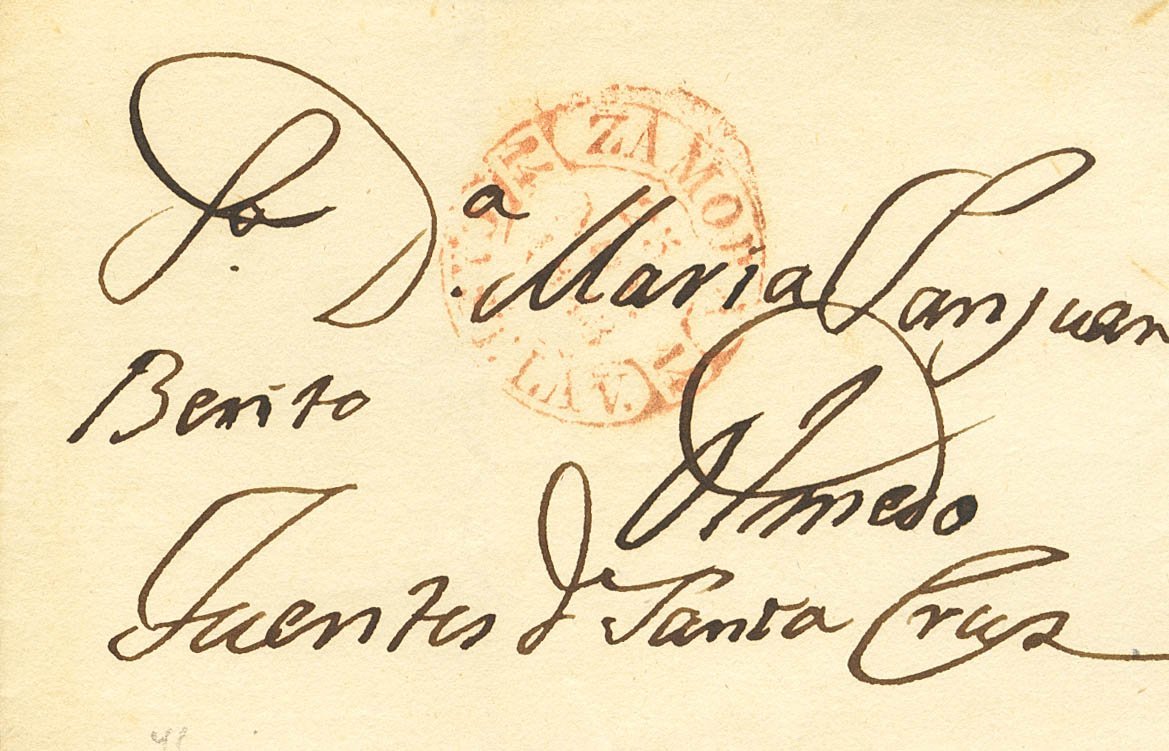 1843. ZAMORA a FUENTE DE SANTA CRUZ (SEGOVIA). En el frente baeza ZAMORA / CAST. LA.V, en rojo. MAGNIFICA.