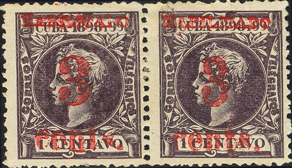 ★ 13, 13A. 1898. 3 ctvos sobre 1 ctvo violeta, pareja. 4ª tirada, posiciones 1 y 2. MAGNIFICA Y MUY RARA. Cert. ECHENAGUSIA.