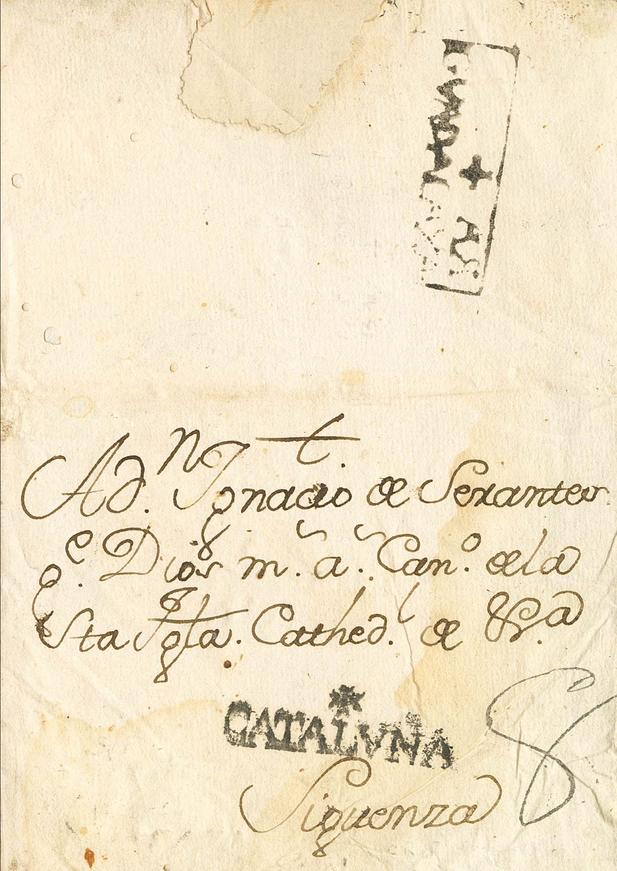 (1740ca). BARCELONA a SIGÜENZA (envuelta sin fecha). Marca + / CATALVÑA (deducimos que se trata de Barcelona por ir enviada al Notario Apostólico Ignacio de Serantes), al dorso marca +AR / GVADALAXA, en tinta de escribir. MAGNIFICA Y EXTRAORDINARIAMENTE RARA, ESTA MARCA DE GUADALAJARA NO APARECE RESEÑADA EN LA OBRA DE TIZON Y CON TODA SEGURIDAD SE TRATA DE LA MARCA POSTAL MAS ANTIGUA UTILIZADA EN GUADALAJARA CUANDO ADMISTRATIVAMENTE AUN DEPENDIA DE LA ADMISTRACION POSTAL Nº1 CORRESPONDIENTE A CASTILLA LA NUEVA, POSTERIORMENTE FUE TRASLADADA A LA Nº2, DEMOMINADA ALCARRIA.