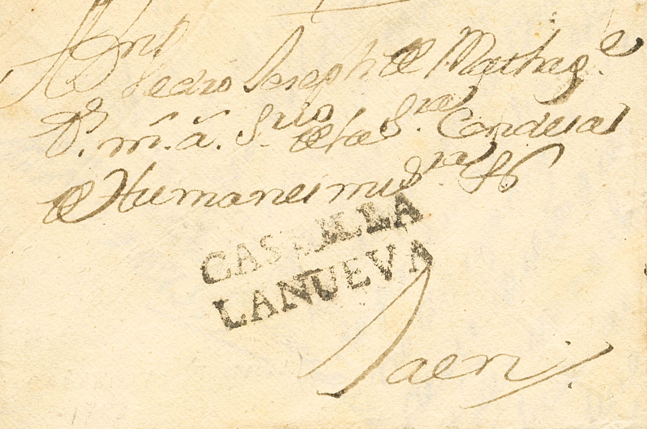 1753. CABANILLAS DEL CAMPO (GUADALAJARA) a JAEN. Marca CASTILLA / LANUEVA, en negro y aplicada en tránsito por Guadalajara (P.E.1) edición 2004. MAGNIFICA Y EXTRAORDINARIAMENTE RARA, SIN DUDA SE TRATA DE UNA LAS MARCAS MAS ANTIGUAS UTILIZADAS EN ESTA LOCALIDAD Y CON TODA SEGURIDAD ES LA RESEÑADA EN LA OBRA DE TIZON. Ex-Antonio Cuesta.