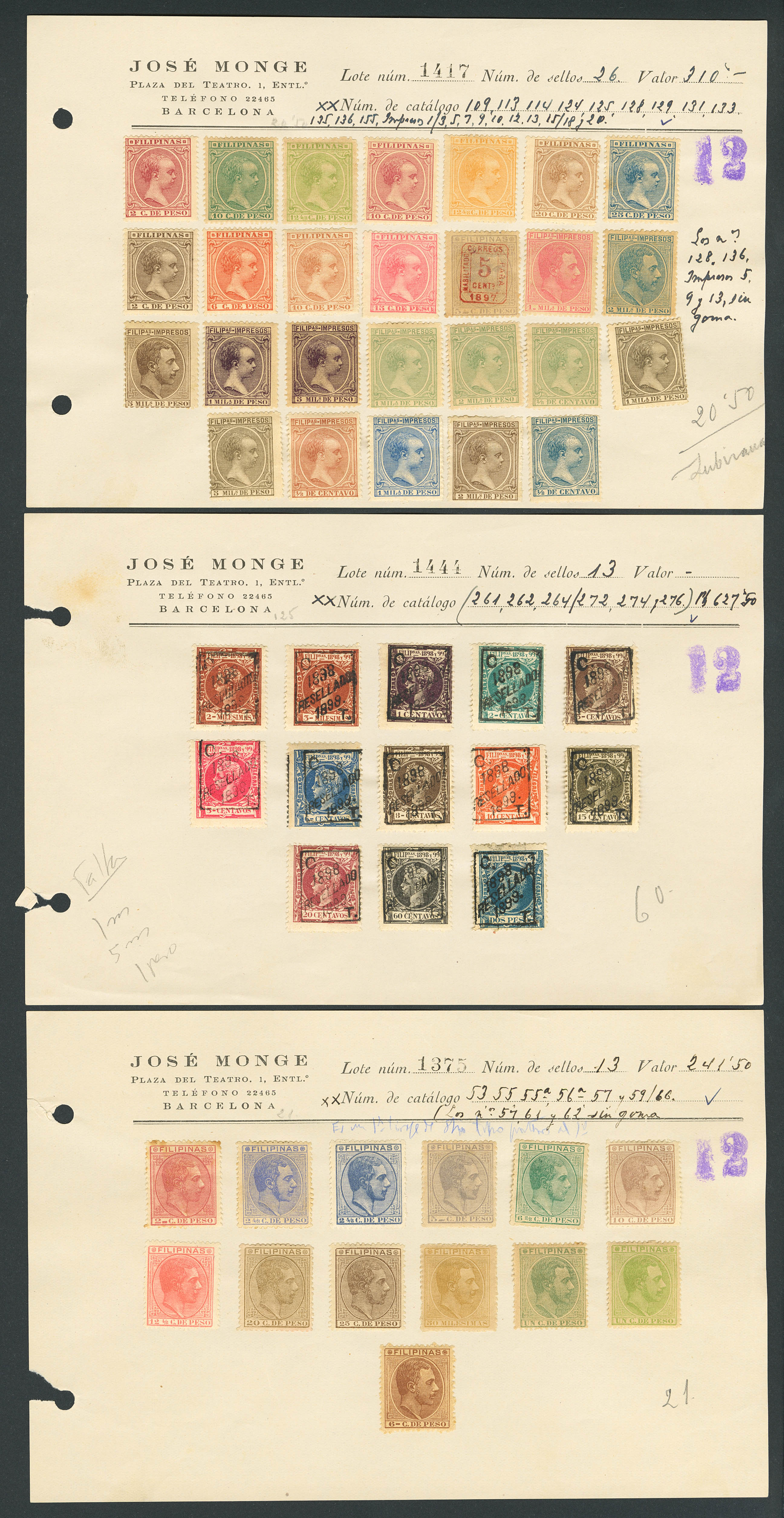 ★/(★)(1880ca). Conjunto de decenas de sellos de diferentes emisiones entre 1880 y 1898, en nuevo y montados en fichas de subasta antiguas de José Monge. A EXAMINAR. Ex-Antonio Cuesta.