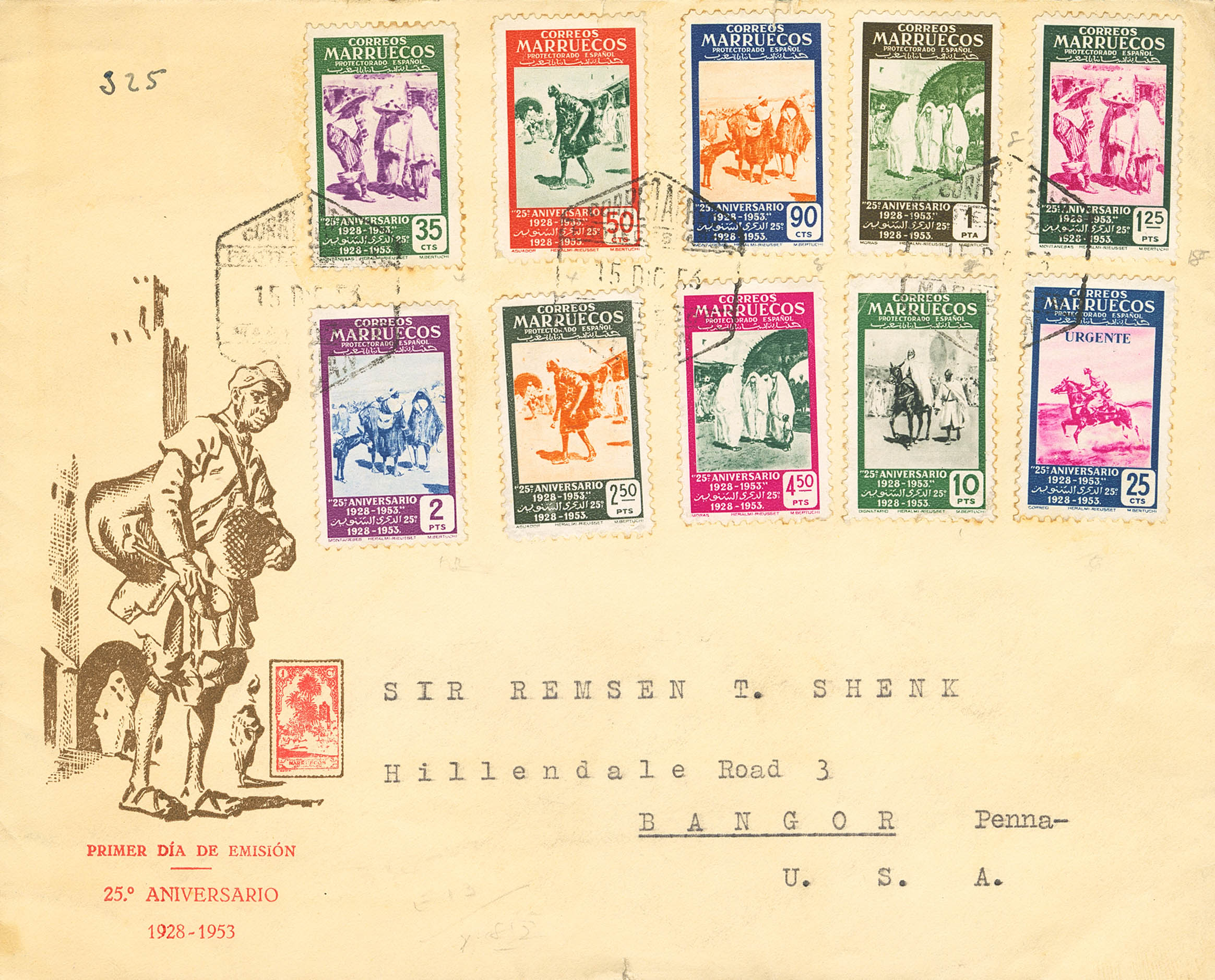 384/93. 1956. Serie completa. Certificado de TETUAN a BANGOR (U.S.A.). Al dorso llegada. MAGNIFICA.
