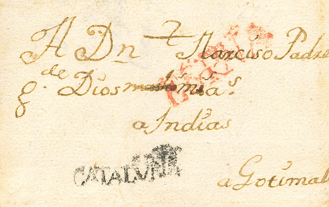 1771. CENTELLES (BARCELONA) a GUATEMALA. Marca CATALUÑA, en negro de Barcelona (muy probablemente P.E.35) edición 2004 y ESPAÑA, en rojo que podría estar aplicada en tránsito por Cartagena de Indias. MAGNIFICA Y RARISIMA, UNA DE LAS CARTAS MAS ANTIGUAS DIRIGIDAS A GUATEMALA. Ex-Antonio Cuesta.