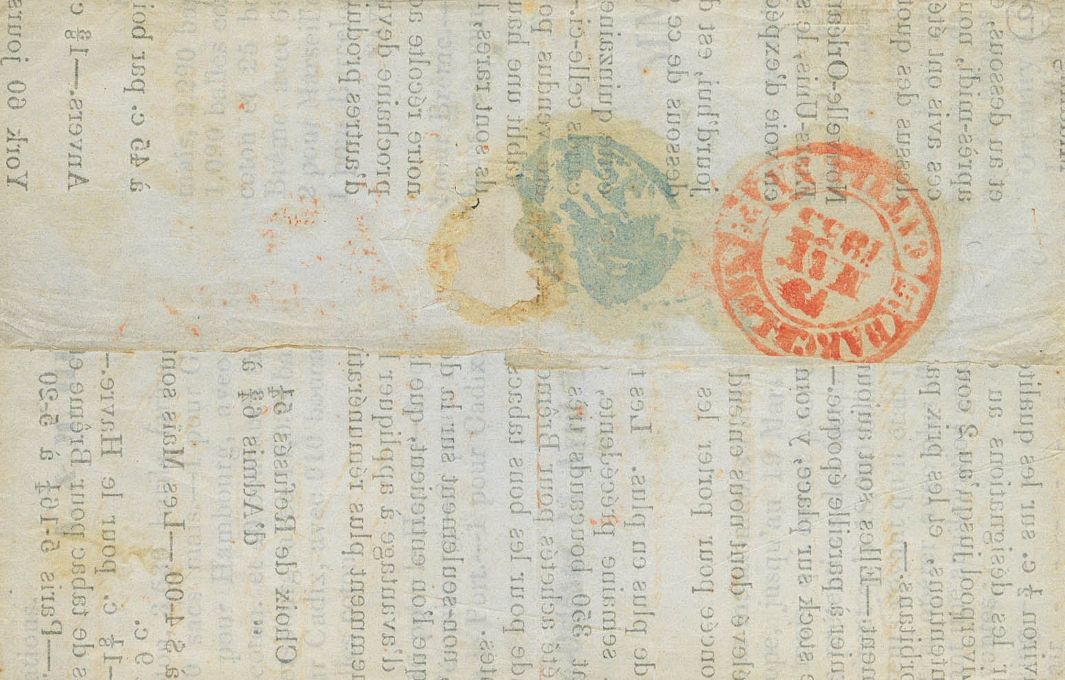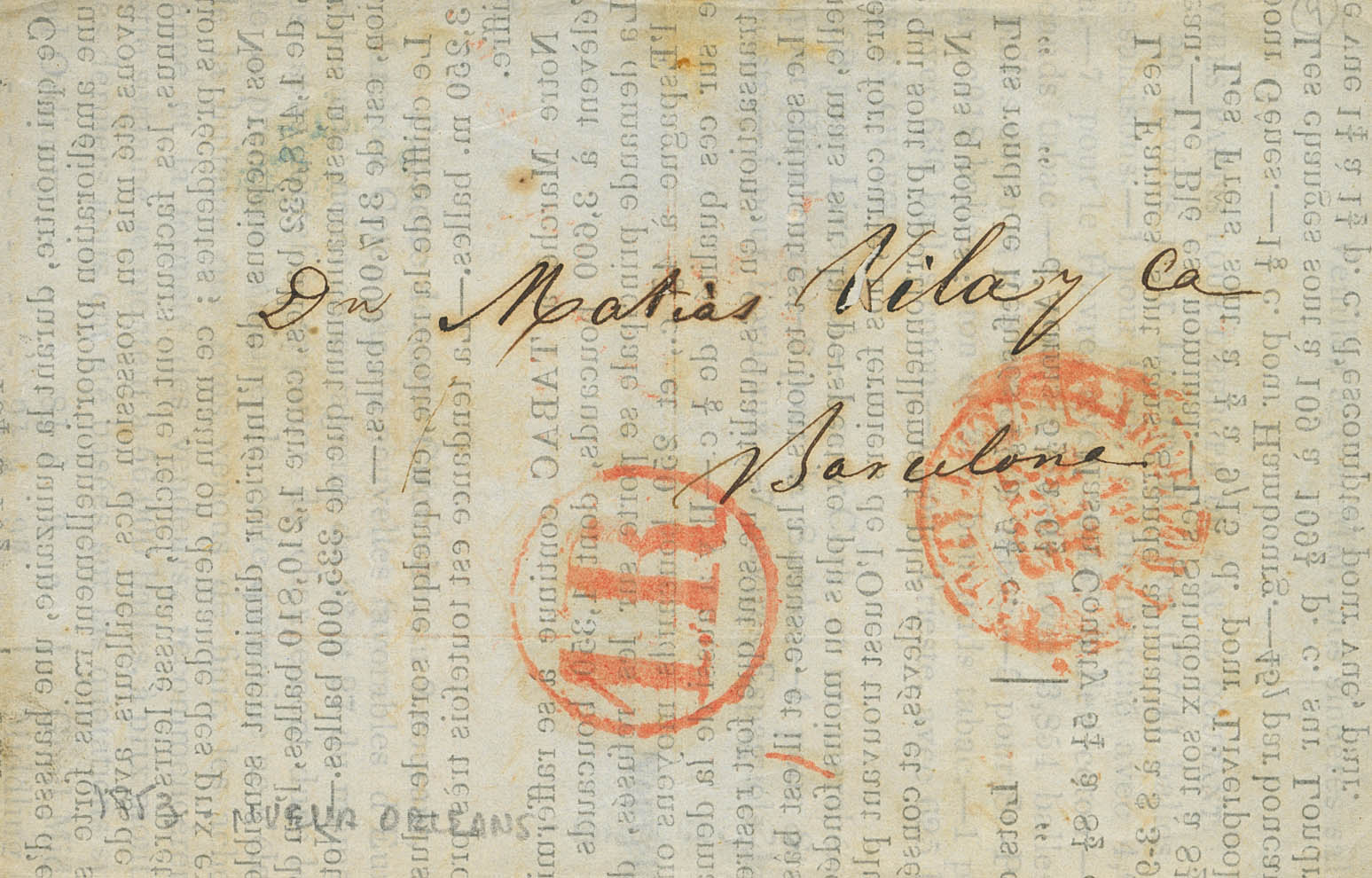 1853. NUEVA ORLEANS a BARCELONA, encaminada privadamente hasta Barcelona donde se deposita en el correo. Al dorso marca de llegada "RR", en azul (P.E.82) edición 2004. MAGNIFICA Y RARISIMA.