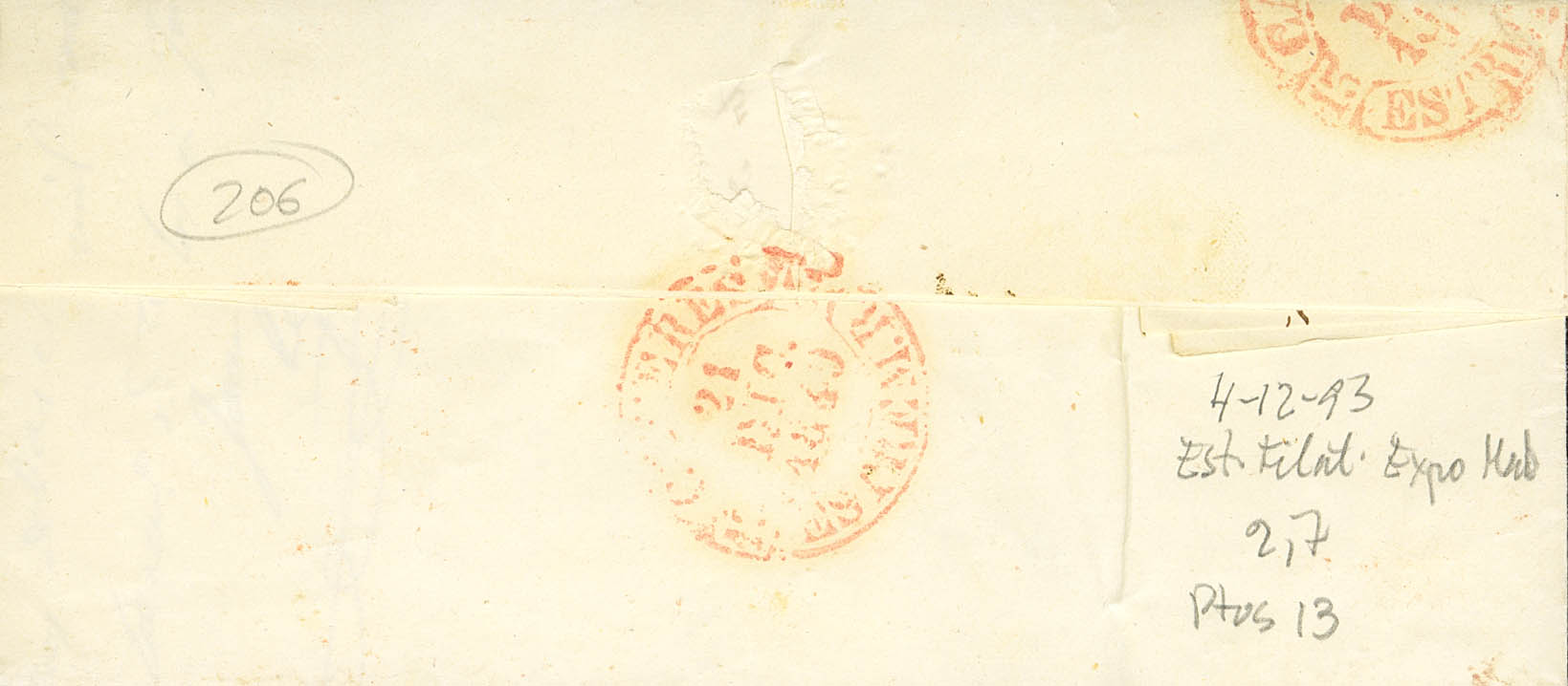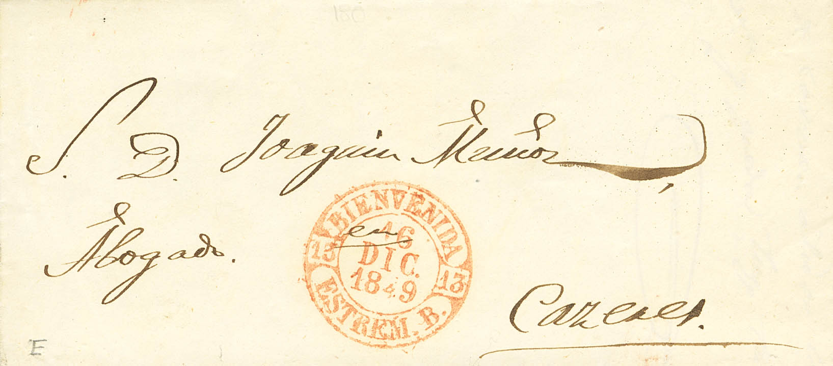 1849. BIENVENIDA (BADAJOZ) a CACERES. En el frente baeza BIENVENIDA / ESTREM.B, en rojo. MAGNIFICA ESTAMPACION.