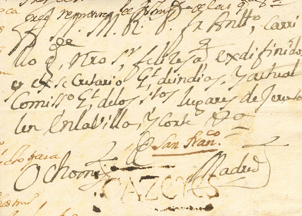 1718. GARROVILLAS (CACERES) a MADRID. Marca CAZERES, en tinta de escribir y aplicada en tránsito (P.E.1) edición 2004. MAGNIFICA Y RARISIMA, CASI CON TODA PROBABILIDAD SE TRATA DE LA MARCA MAS ANTIGUA UTILIZADA EN ESTA LOCALIDAD, YA QUE LA FECHA MAS ANTIGUA CATALOGADA POR TIZON ES EN 1720, PIEZA DE ENORME IMPORTANCIA. Ex-Antonio Cuesta.