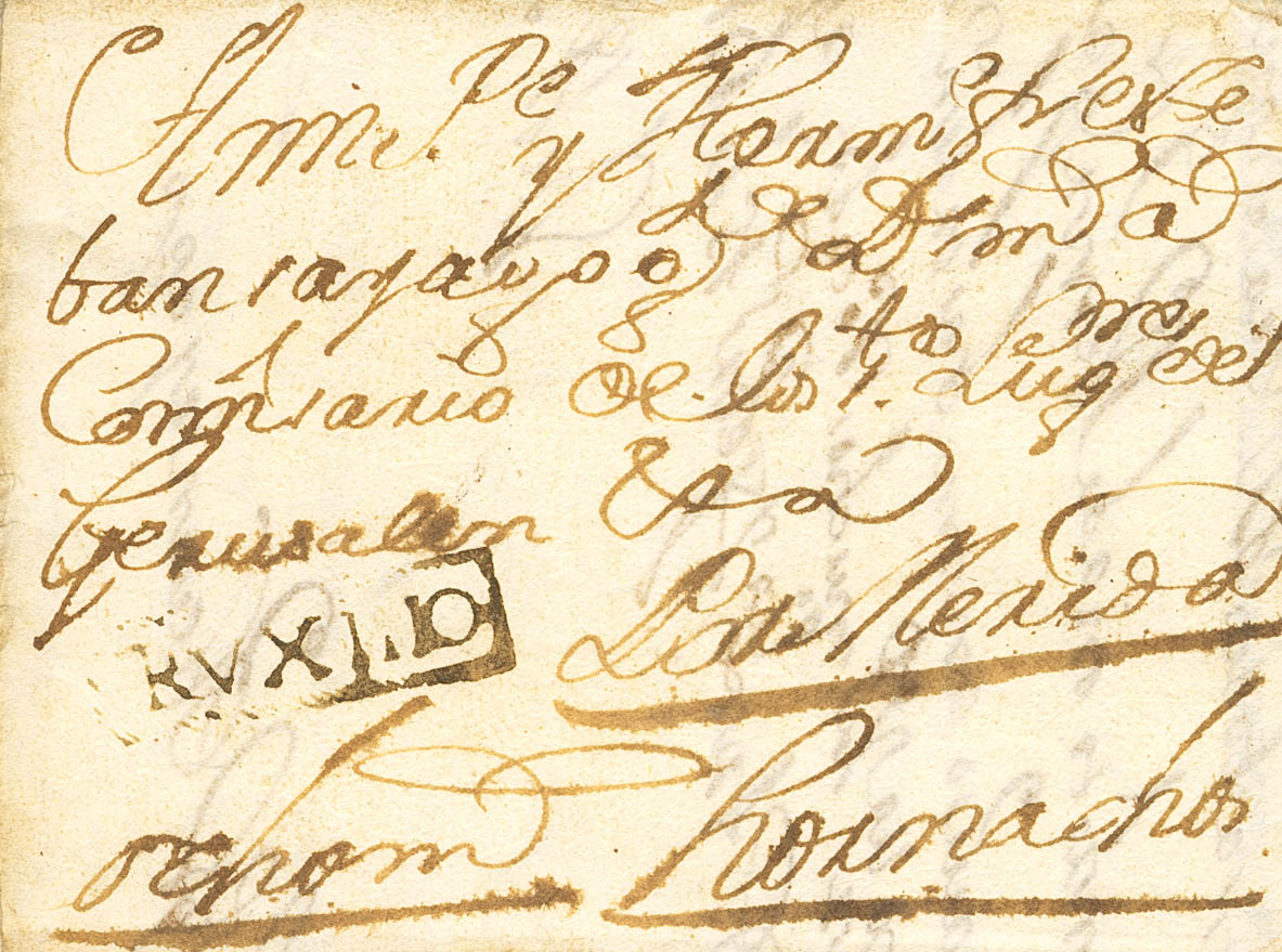 1717. TRUJILLO (CACERES) a HORNACHOS (BADAJOZ). Marca TRVXILLO, en tinta de escribir (P.E.1) edición 2004. MAGNIFICA Y RARISIMA, CASI CON TODA PROBABILIDAD SE TRATA DE LA MARCA MAS ANTIGUA UTILIZADA EN ESTA LOCALIDAD, TIZON CATALOGA LA MAS ANTIGUA EN 1719. Ex-Antonio Cuesta.