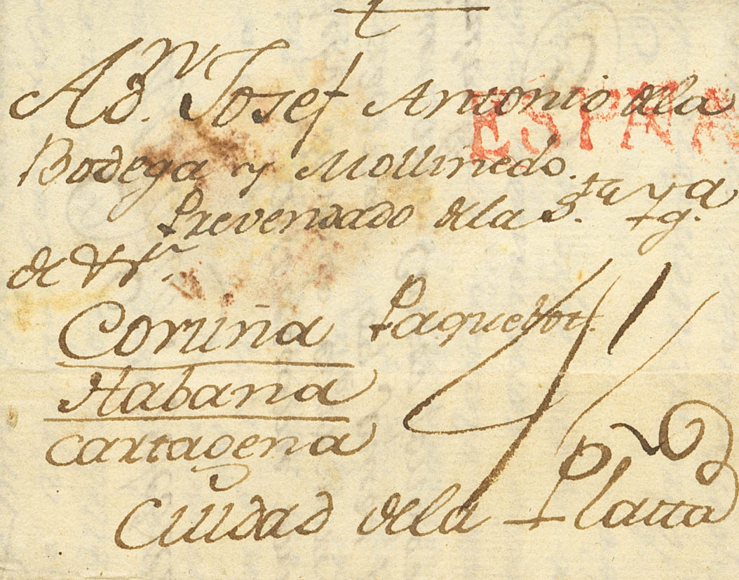 1783. MADRID a LA PLATA (ARGENTINA). Marca ESPAÑA, en rojo aplicada en tránsito por La Coruña (P.E.26) edición 2004 y anotaciones manuscritas "Coruña", "Habana", "Cartagena" y "Paquebot". MAGNIFICA Y RARA. Ex-Antonio Cuesta.