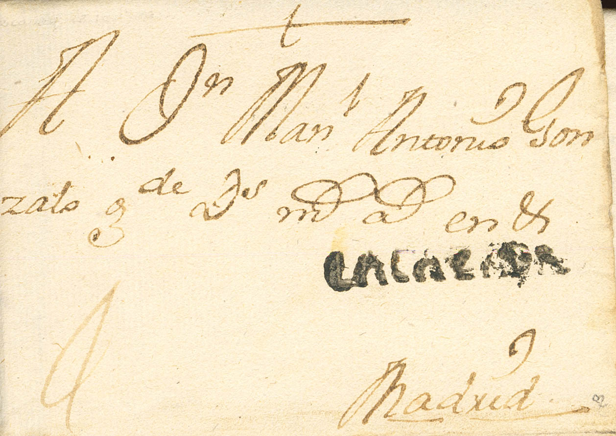 1740. EZCARAY (LA RIOJA) a MADRID. Marca LACAZADA, en negro aplicada en tránsito por Santo Domingo de la Calzada (P.E.1) edición 2004. MAGNIFICA Y EXTRAORDINARIAMENTE RARA, CASI CON TODA PROBABILIDAD SE TRATA DE LA MARCA MAS ANTIGUA UTILIZADA EN ESTA LOCALIDAD Y CON TODA SEGURIDAD ES LA RESEÑADA EN LA OBRA DE TIZON. Ex-Antonio Cuesta.