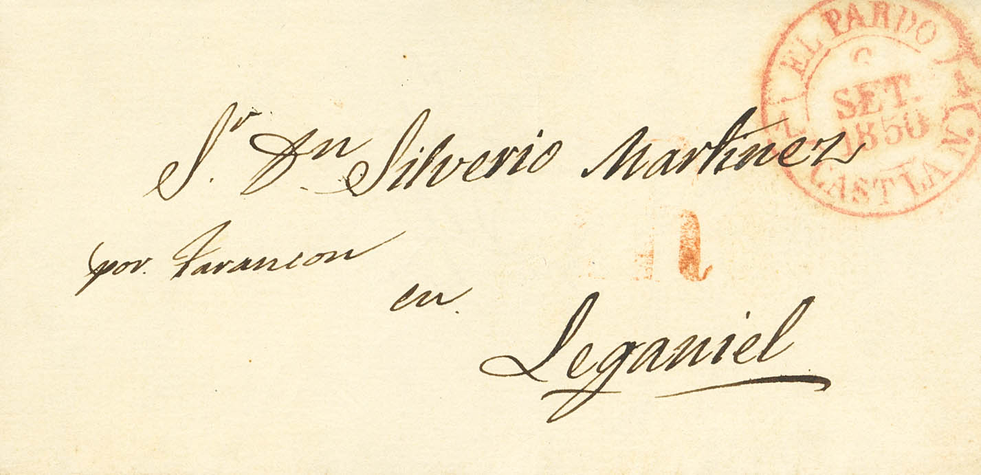 1850. EL PARDO a LEGANIEL (CUENCA). Baeza EL PARDO / CAST.LA N., en rojo. MAGNIFICA Y MUY RARA.