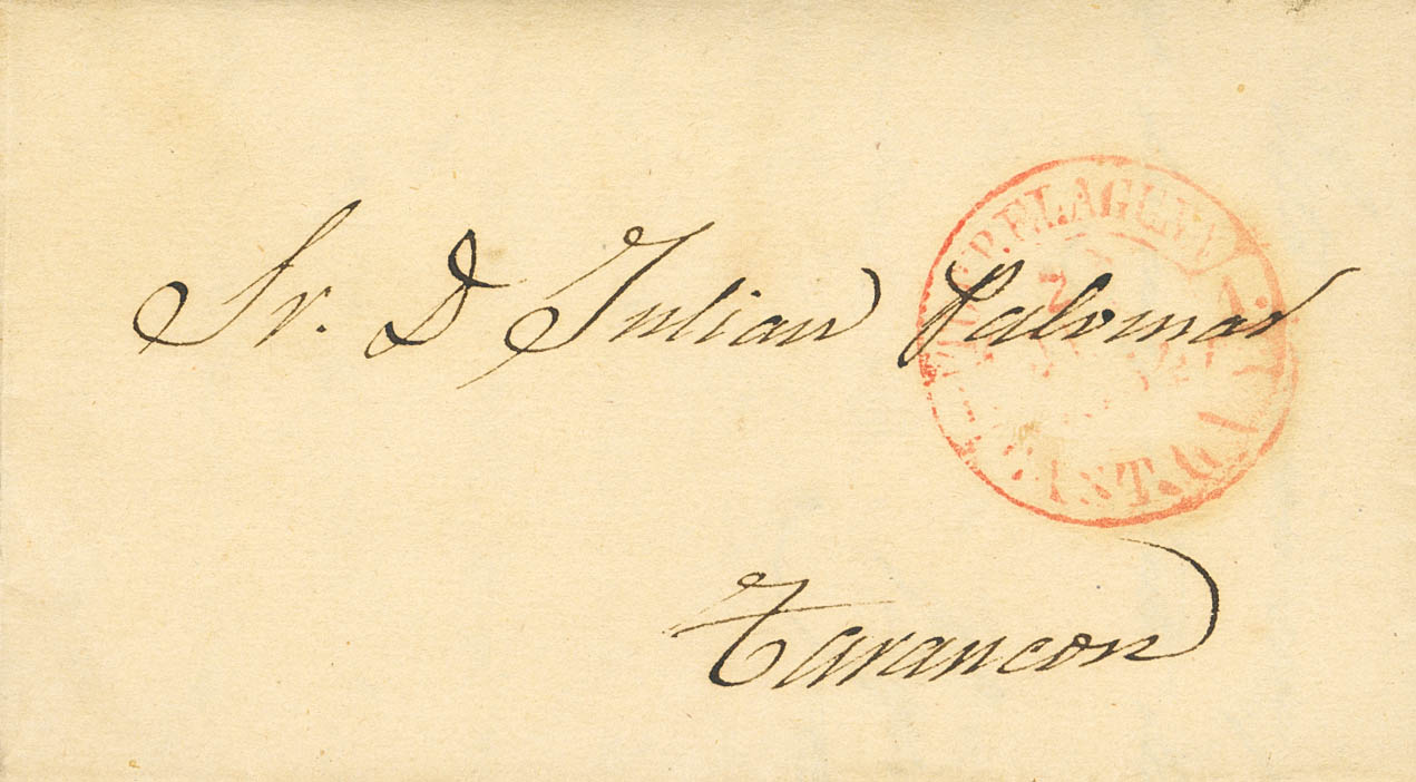 1854. PONTON DE LA OLIVA (MADRID) a TARANCON (CUENCA), remitida desde la Caserna del Presidio del Cerro de la Oliva, Patones. Con motivo de la construcción de la presa del Pontón de la Oliva, para el Canal de Isabel II, se desplazaron un gran número de obreros, entre ellos, más de mil quinientos presos, la mayoría procedentes de las Guerras Carlistas y para su alojamiento, se construyó un edificio que parte era destinada a presidio. Baeza TORRELAGUNA / CAST.LA.N. MAGNIFICA Y MUY RARA, ESPECIALMENTE DESDE ESTA INUSUAL UBICACION.
