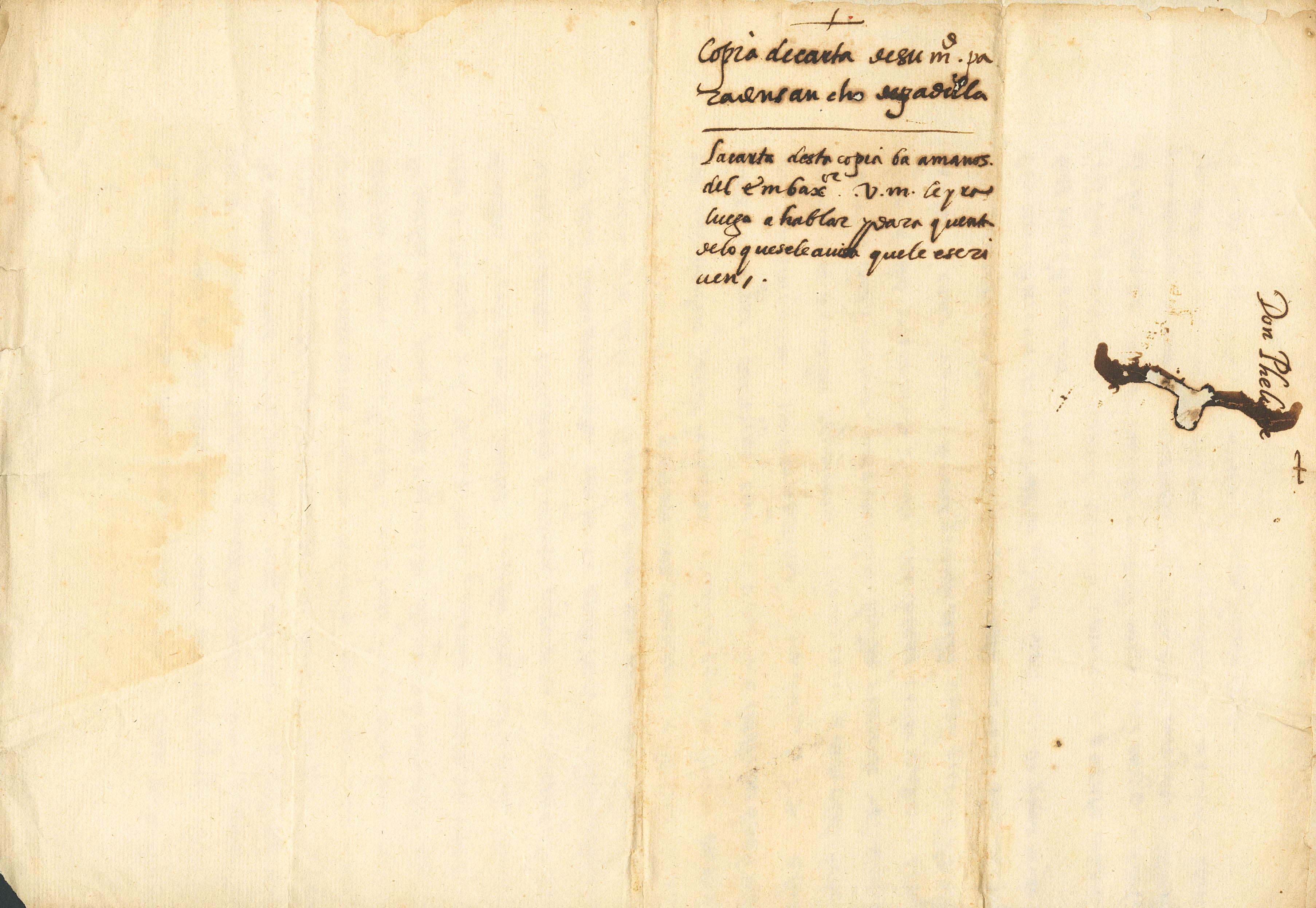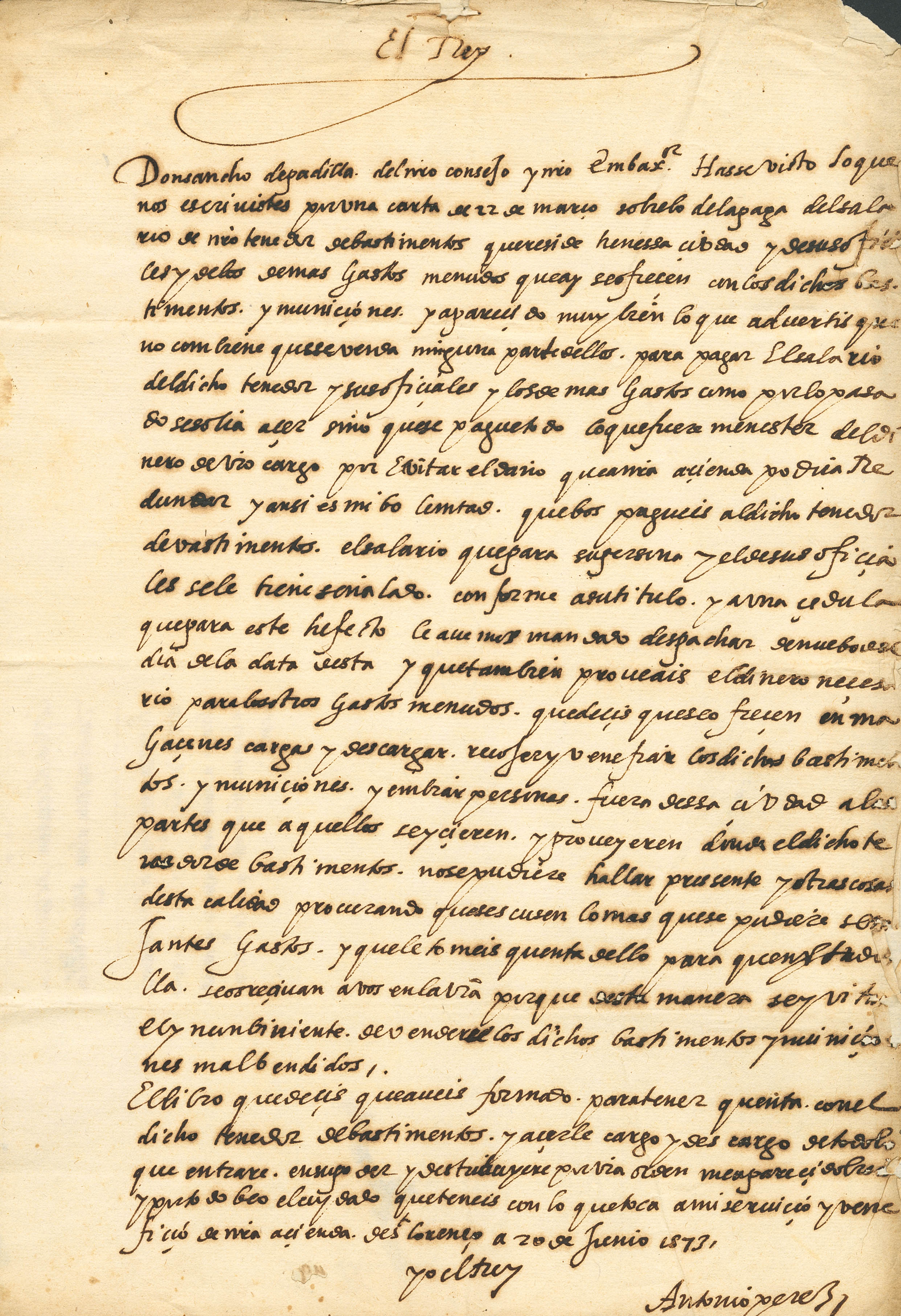 1576. SAN LORENZO DE EL ESCORIAL a MILAN, carta en copia remitida por Felipe II a Don Sancho de Guevara y Padilla, Castellano Sforzesco de Milán, miembro del Consejo Secreto de Felipe II y nombrado Gobernador de MILAN en Abril de 1580. Firmas "Yo el Rey" y Antonio Pérez, Secretario de Cámara de Felipe II y del Consejo de Estado. MAGNIFICA Y RARA.