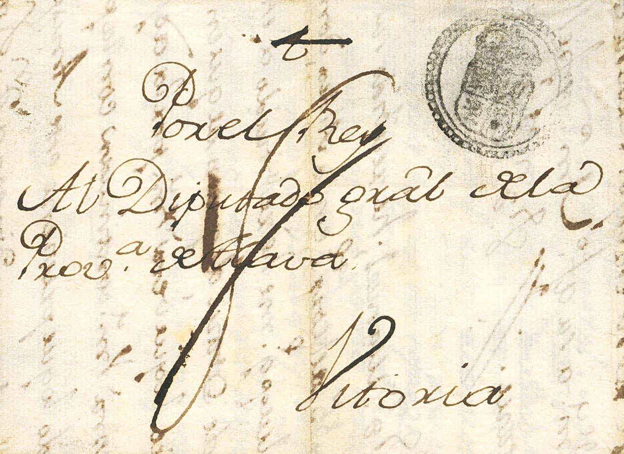 1782. MADRID a VITORIA. En el frente manuscrito "Por el Rey" y marca de Correo Real, en negro (P.E.40) edición 2004. MAGNIFICA Y RARISIMA. Ex-Antonio Cuesta.