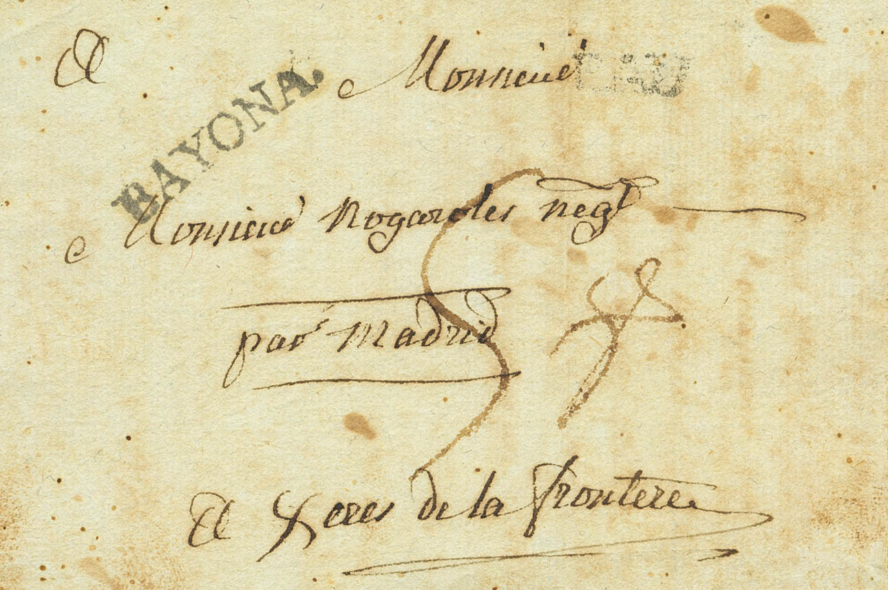 1786. FRANCIA a JEREZ DE LA FRONTERA. Marca BAYONA, de Irún aplicada en tránsito para indicar la procedencia (P.E.18) edición 2004. MAGNIFICA.