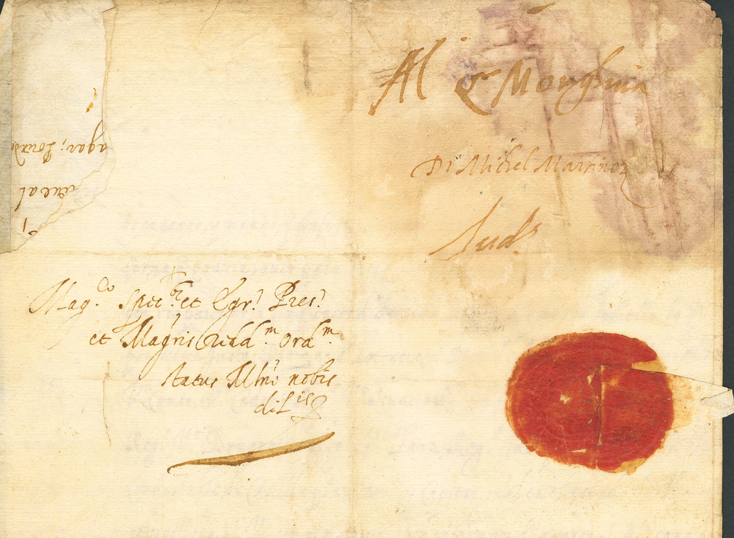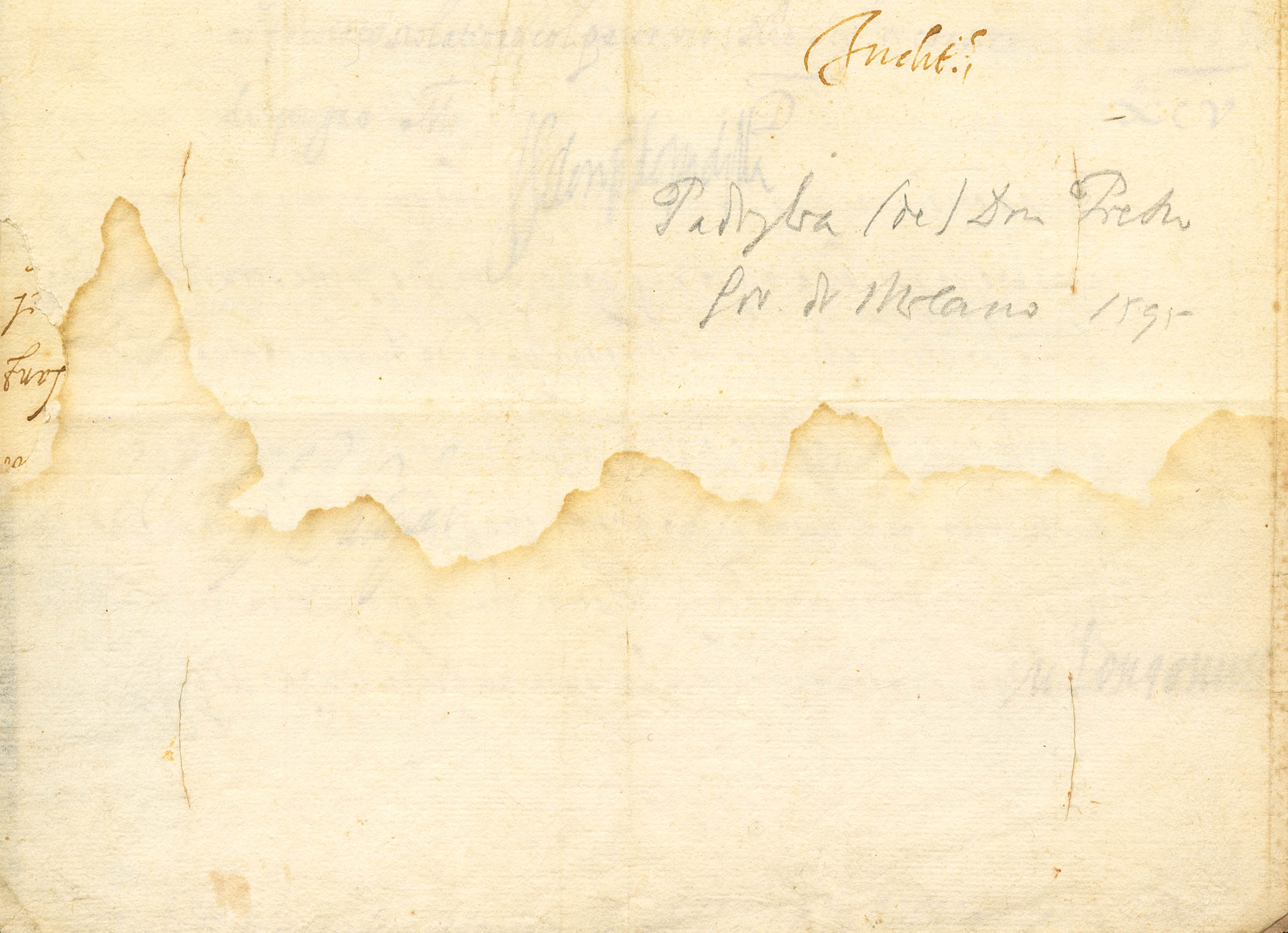 1595. Correo Interior de MILAN, remitida por Pedro de Padilla, Gobernador de Milán interino en ausencia de Juan Fernández de Velasco y dirigida al Magistrado Rector del Estado de Milán acerca de una carta del Rey de España Felipe II (manchas de humedad y alguna falta de papel). BONITA Y RARA.